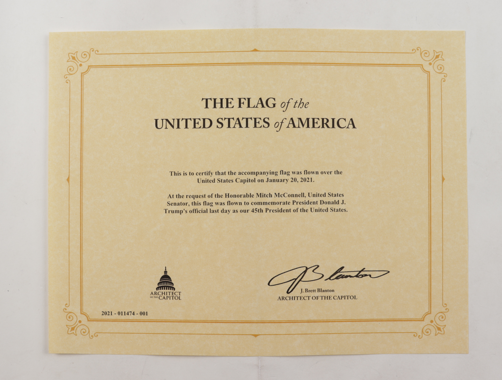 This flag was flown over the United States Capitol on January 20, 2021. At the request of the honorable Mitch McConnell, United States senator, this flag was flown to commemorate President Donald J. Trump's official last day as our 45th President of the United States.
