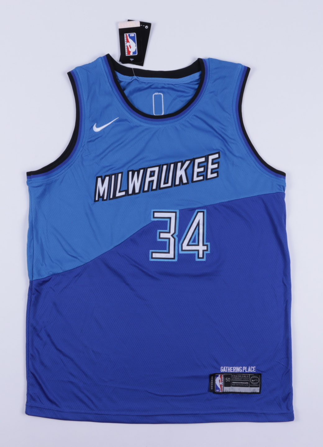 Nike on-court style jersey. Everything sewn on, size 50. Has been hand-signed by Giannis Antetokounmpo (Milwaukee Bucks).