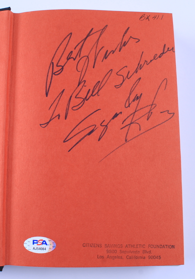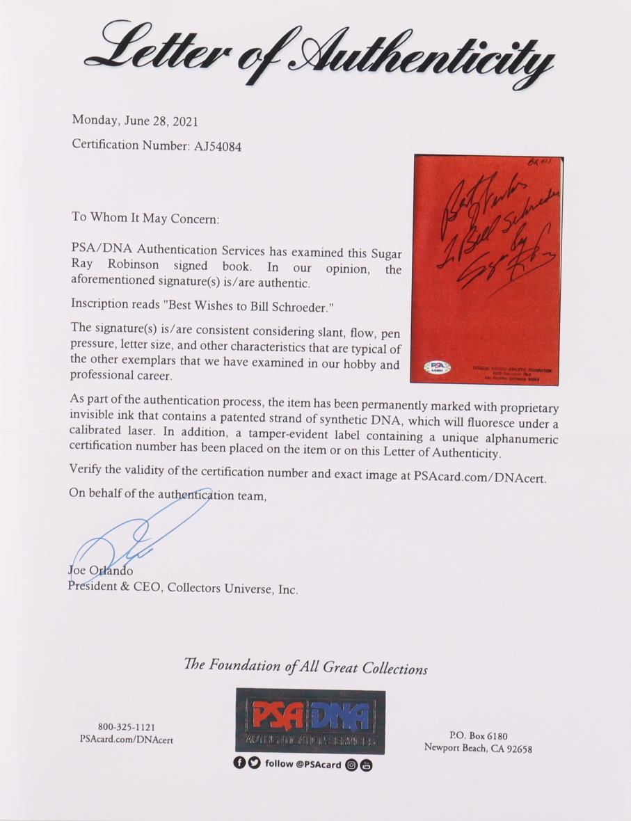 "Sugar Ray" Hardcover Book has been hand-signed and inscribed on the inside cover page by Sugar Ray Robinson (D. 1989, HOF). Please note, book has been personalized "2 Bill Schroeder", Book shows signs of wear.