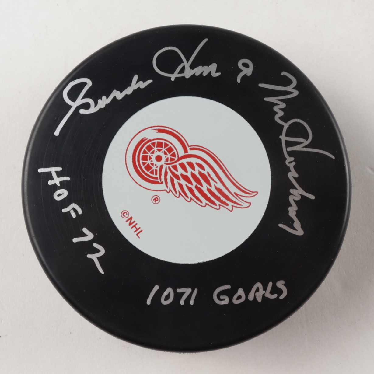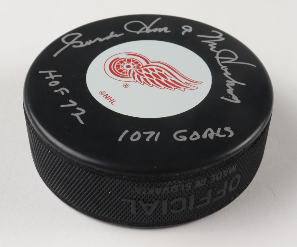 Detroit Red Wings Logo hockey puck. Hand-signed by Gordie Howe (D. 2016, HOF).