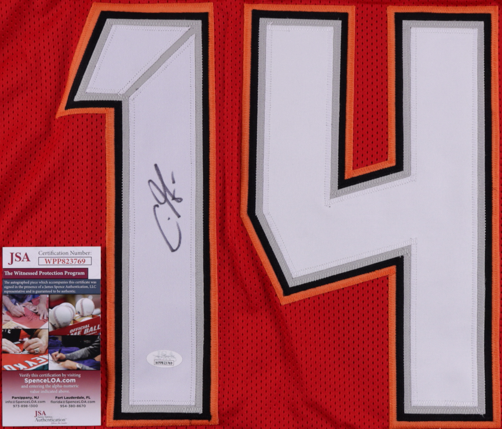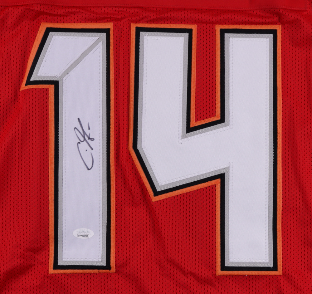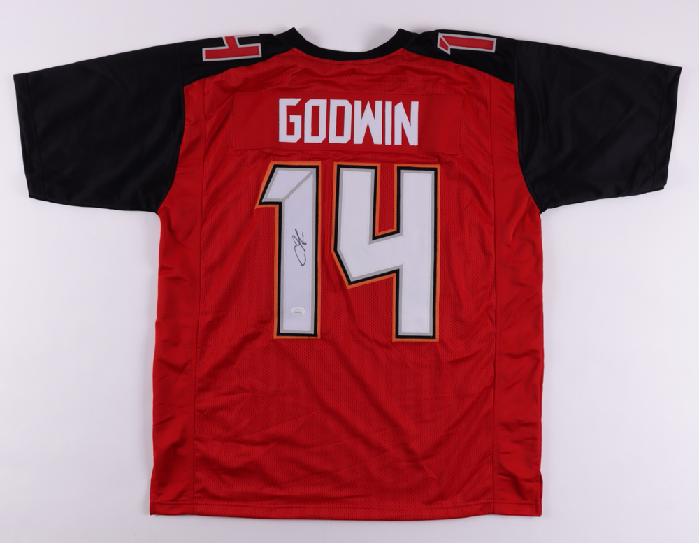 Custom on-field style jersey. Everything is sewn on, size XL. Has been hand-signed by Chris Godwin.