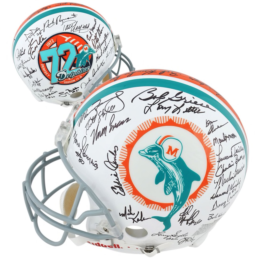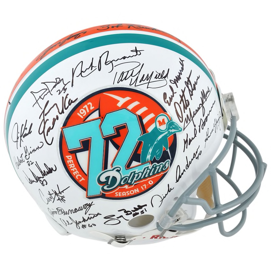Riddell Miami Dolphins full-size authentic on-field helmet. Hand-signed by (40) members of the 1972 Miami Dolphins team.
