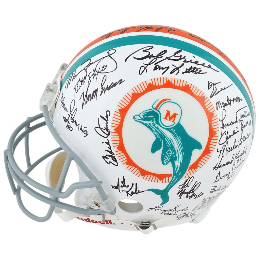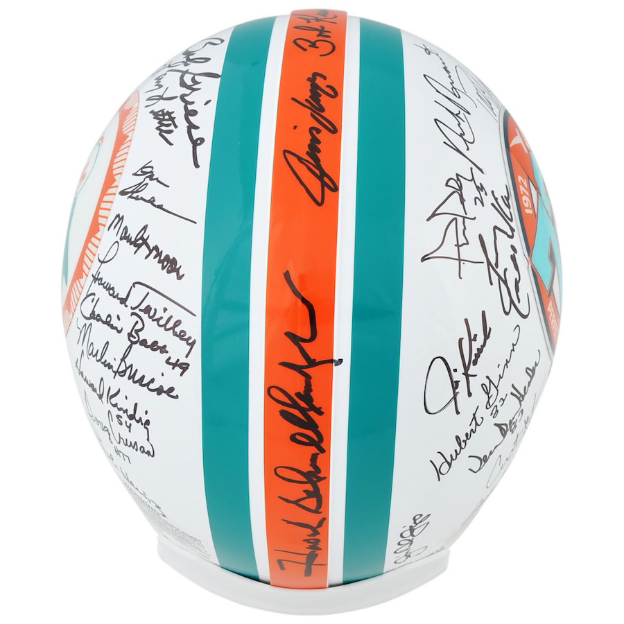 This helmet has been personally hand-signed by the 1972 Miami Dolphins commemorating their perfect season. Including; Dick Anderson, Charles Babb, Larry Ball, Marlin Briscoe, Nick Bouniconti, Doug Crusan, Larry Csonka, James Del Gaizo, Vern Den Hereder, Jim Dunaway, Norm Evans, Manny Fernandez, Marv Fleming, Tim Foley, Hubert Ginn, Bob Griese, Bob Heinz, Al Jenkins, Ed Jenkins, Curtis Johnson, Jim Kiick, Howard Kindig, Mike Kolen, Bob Kuechenberg, Jim Langer, Larry Little, Maulty Moore, Earl Morrall, Mercury Morris, Lloyd Mumphord, Karl Noonan, Jim Riley, Larry Seiple, Howard Schnellenberger, Don Shula, Bill Stanfill, Otto Stowe, Howard Twilley, Paul Warfield, & Garo Yepremian. It is officially licensed by the National Football League and comes with an individually numbered, tamper-evident hologram from Fanatics Authentic. To ensure authenticity, the hologram can be reviewed online. This process helps to ensure that the product purchased is authentic and eliminates any possibility of duplication or fraud. Includes certificate of authenticity and hologram from Fanatics! The signatures are guaranteed authentic through the Fanatics hologram system. Officially Licensed.
