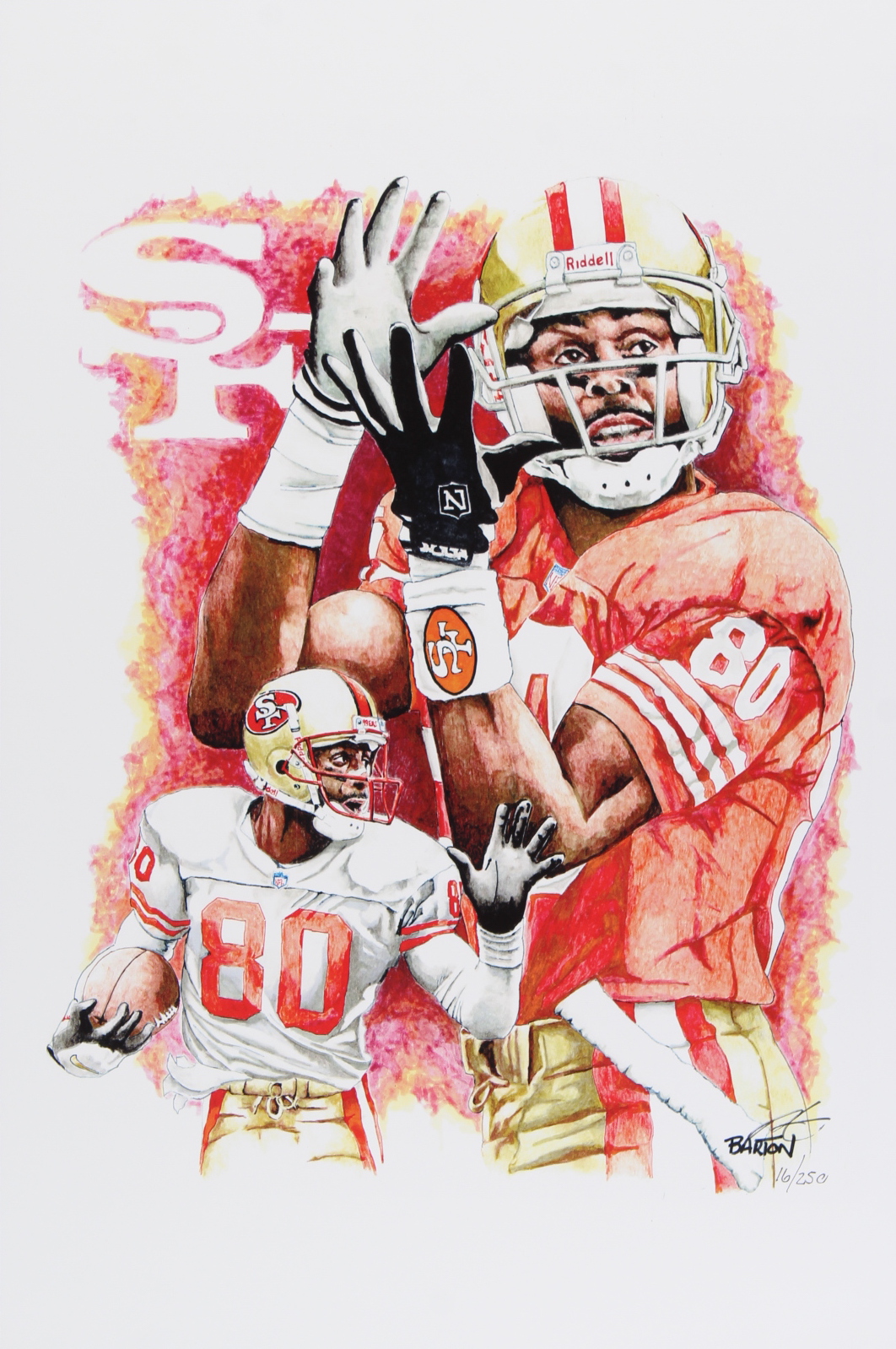 Print measures approximately 12" x 18" in size. The piece is hand-signed and numbered by the artist, Brian Barton and features Jerry Rice (San Francisco 49ers, HOF).