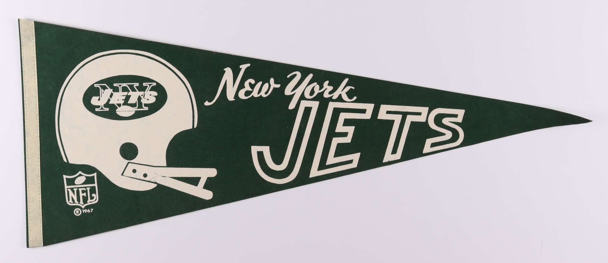 1967 New York Jets Pennant. The pennant measures approximately 30" long. Please see photo for more details regarding the pennant.
