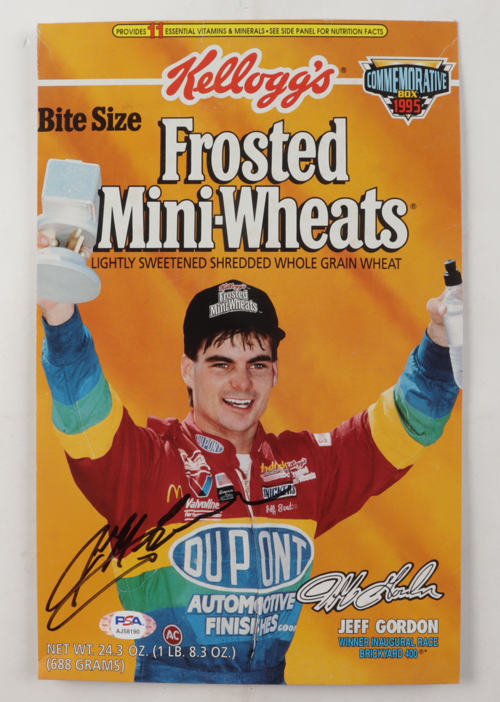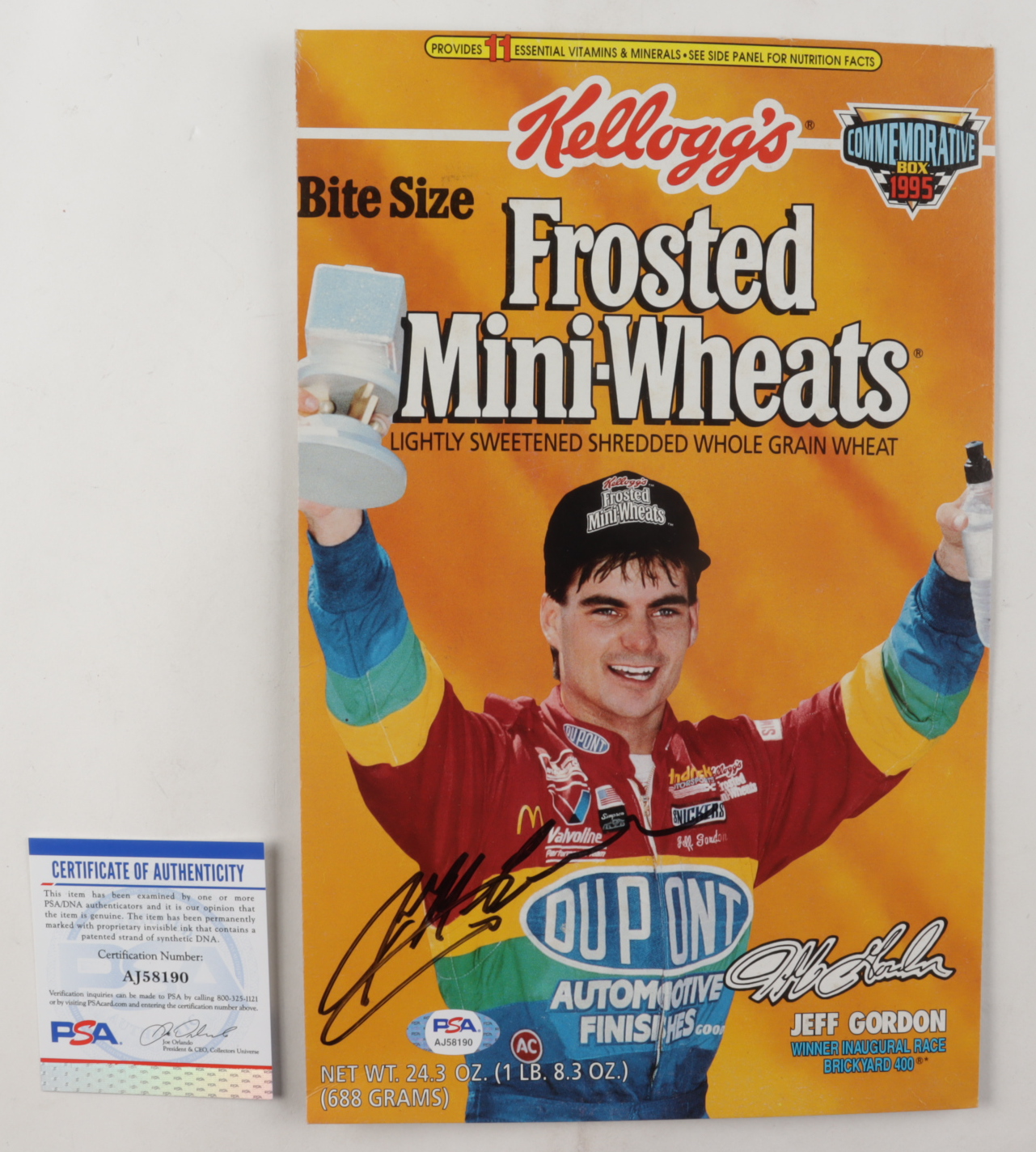 Original 1995 Kellogg's "Frosted Mini-Wheats" cereal box cover has been hand-signed by Jeff Gordon (HOF).