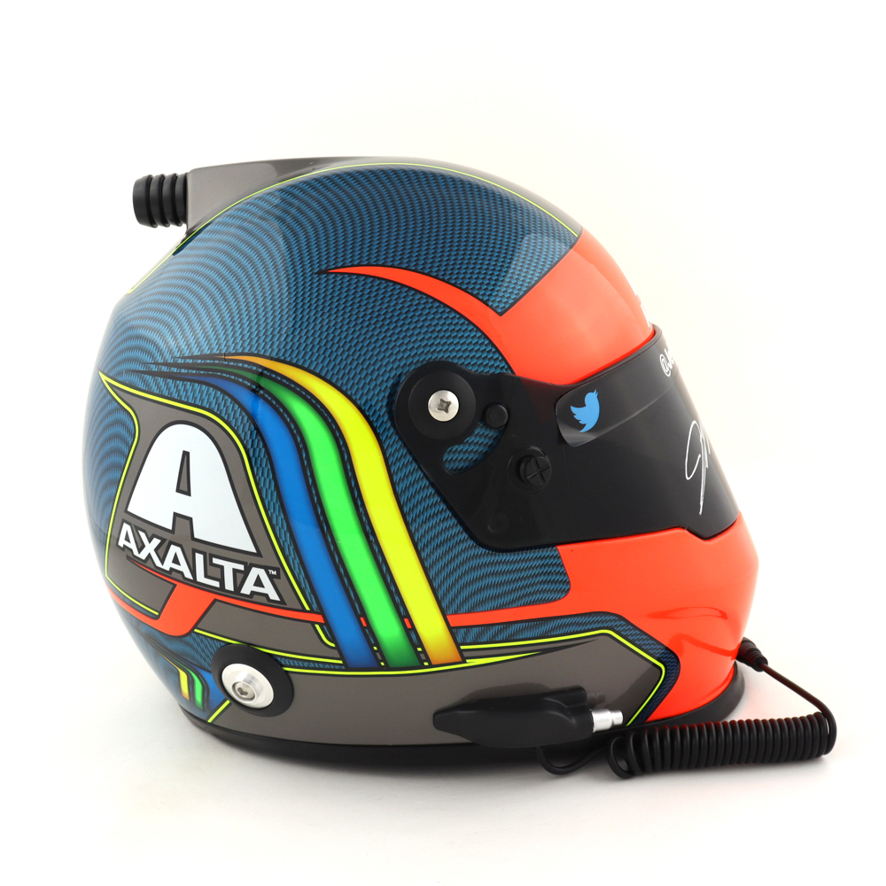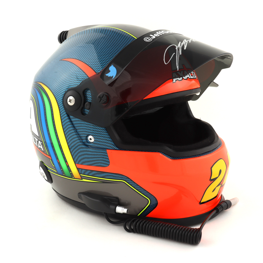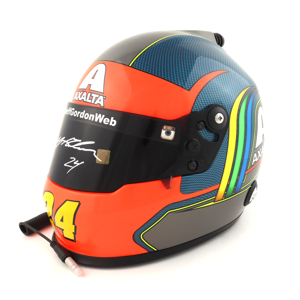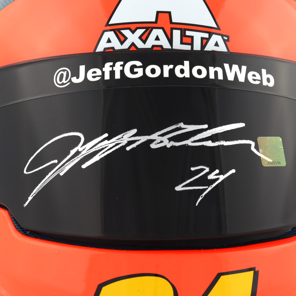 Full-size replica NASCAR helmet is hand-signed on the visor by Jeff Gordon.