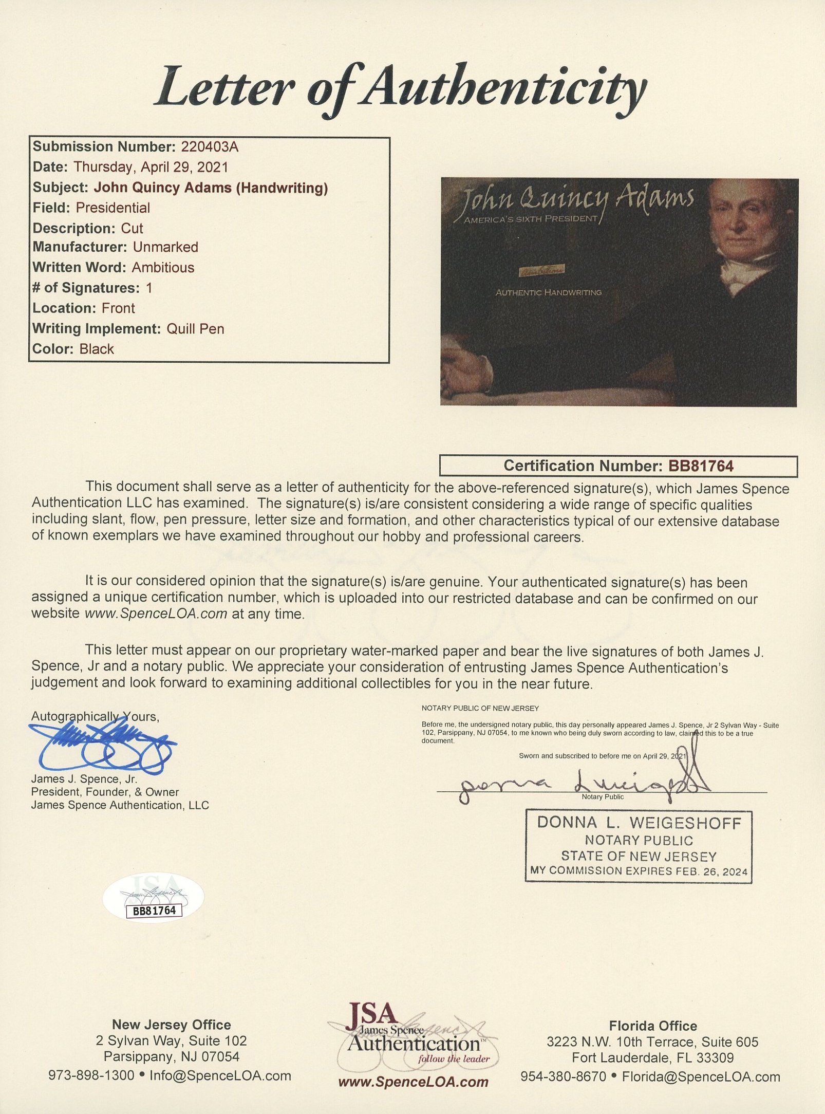 John Quincy Adams 4x6 Photo With Authentic Hand-Written Word Cut (JSA LOA)