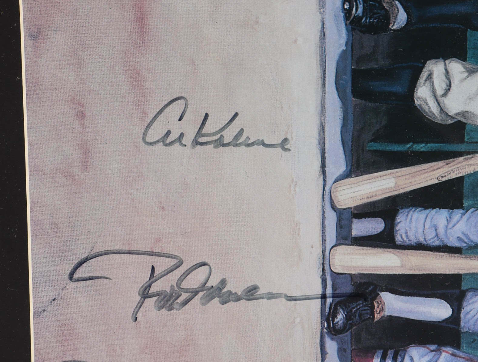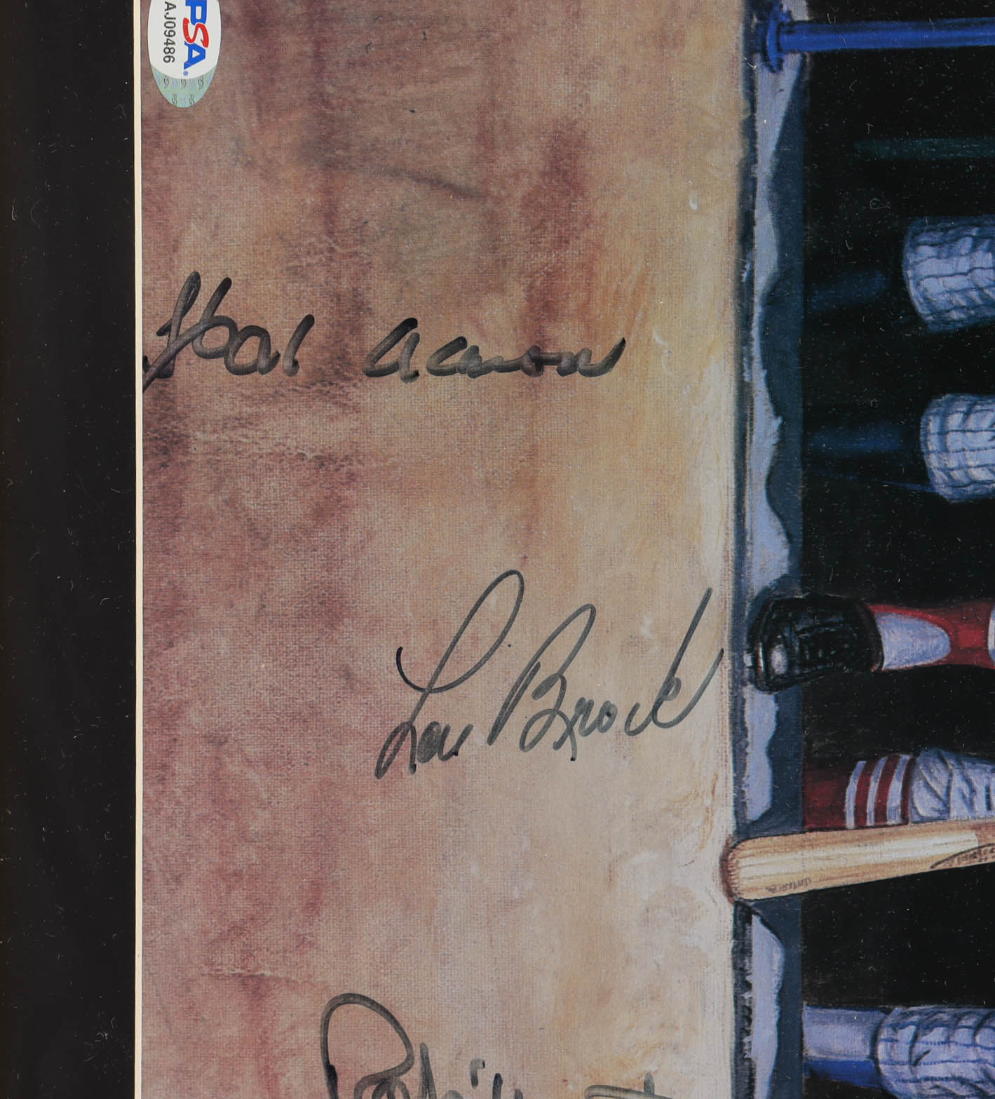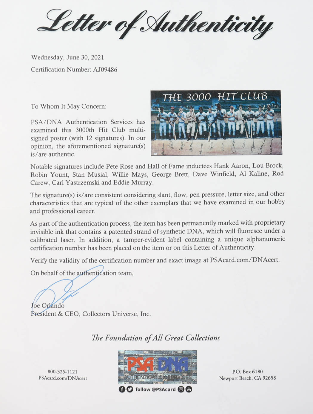 Custom frame measures 21" x 36" in size and features a photo of the 3000 Hit Club and has been signed by (12) including Hank Aaron, Willie Mays, Carl Yastrzemski, Stan Musial, Pete Rose, Lou Brock, Robin Yount, George Brett, Dave Winfield, Al Kaline, Rod Carew, and Eddie Murray. Please note, there is wear along the upper left corner.