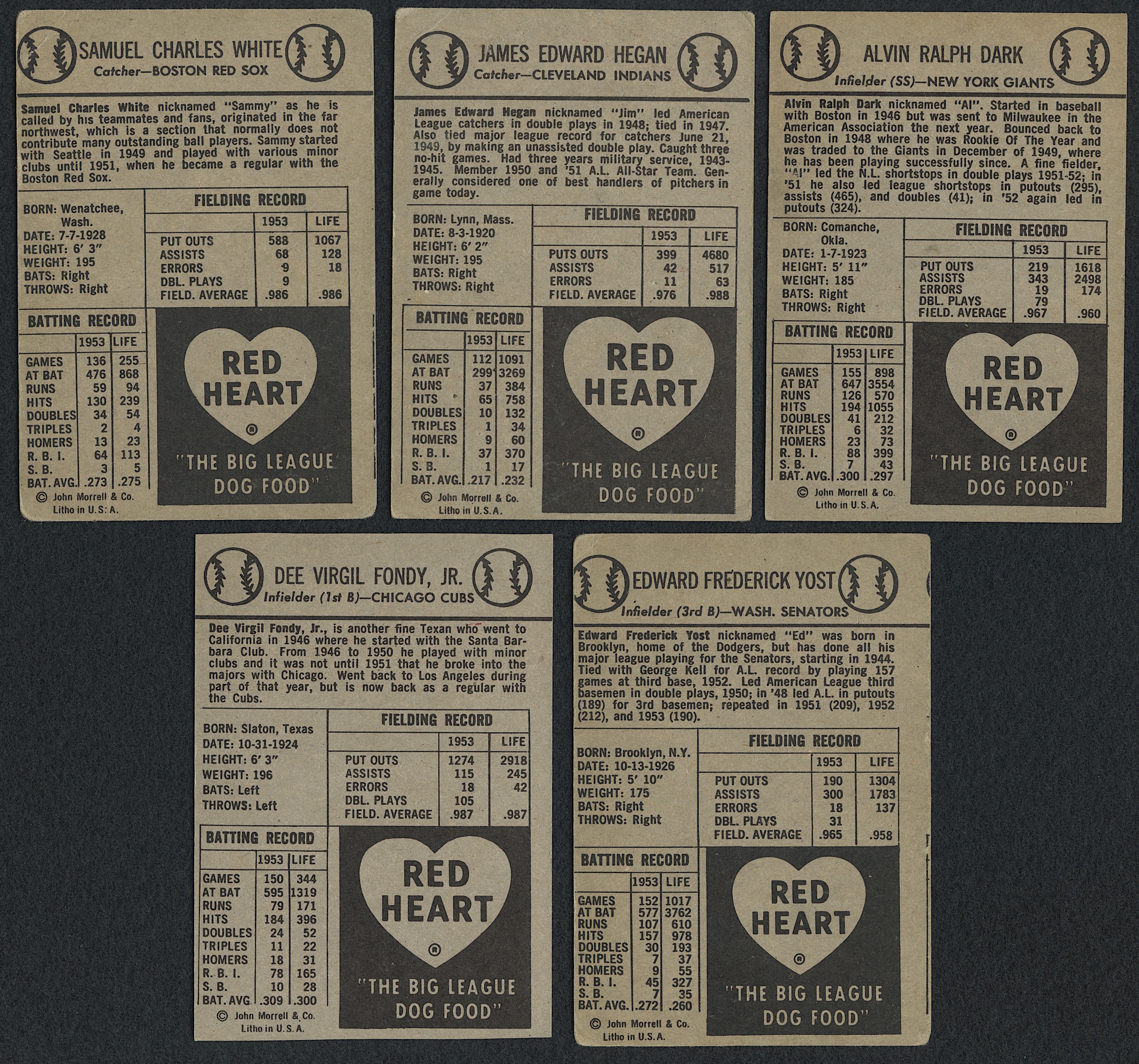 Lot of (5) 1954 Red Heart Baseball Cards