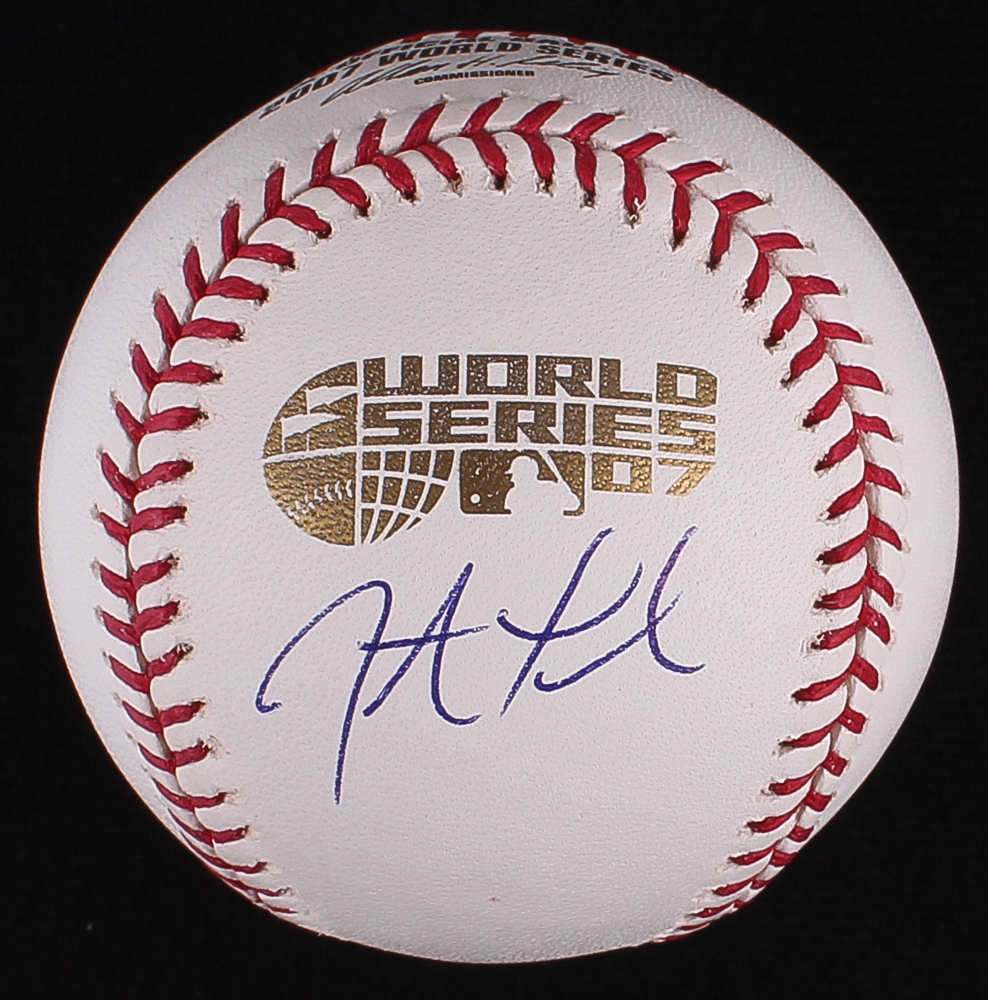 Rawlings Official 2007 World Series Baseball. Hand-signed in blue ink pen by Jonathan Papelbon (Nationals).