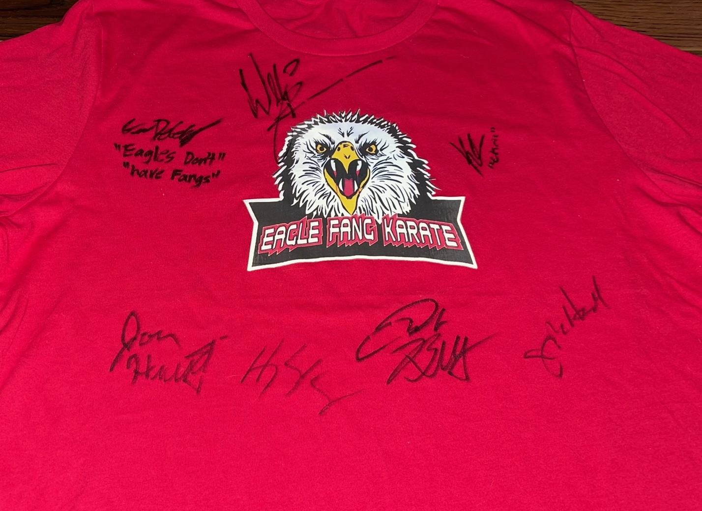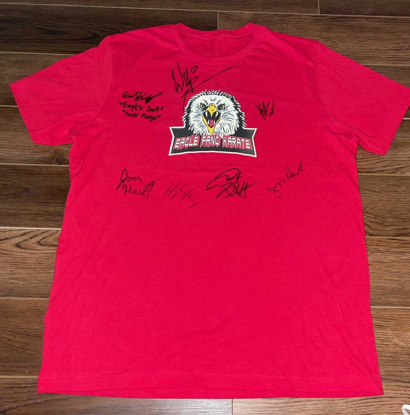 "Cobra Kai" Eagle Fang Karate t-shirt has been hand-signed by (7) with Gianni DeCenzo (Demetri), Hayden Schlossberg (writer, director, producer), Jacob Bertrand (Eli "Hawk" Moskowitz), Jon Hurwitz (writer, director, producer), Josh Heald (writer, director, producer), Khalil Everage (Chris), and William Zabka (Johnny Lawrence).
