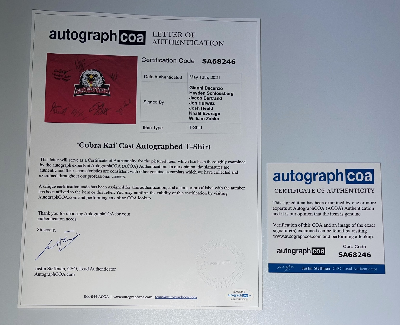 "Cobra Kai" Eagle Fang Karate T-Shirt Signed by (7) with Gianni DeCenzo, Hayden Schlossberg, Jacob Bertrand, Jon Hurwitz (AutographCOA COA & LOA)