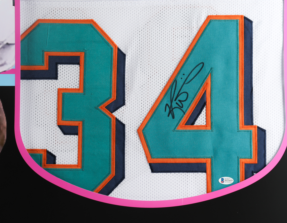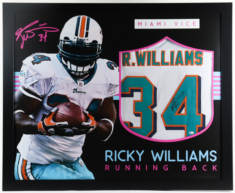 Custom frame measures approximately 35" x 43" in size and features a jersey that has been hand-signed by Ricky Williams. Please note, due to the large size of these frames, some player images may be pixelated. Please see the close-up photo in the listing for item condition.