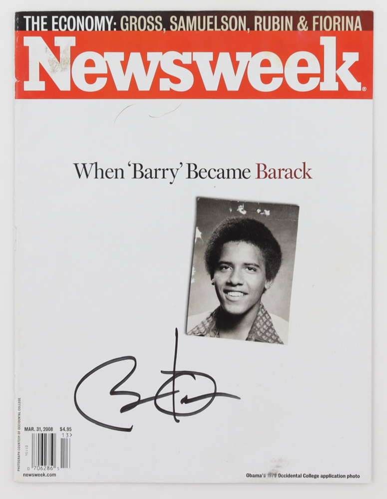 Cover from the 2008 issue of News Week magazine has been hand-signed by Barack Obama. Please note, this auction is a magazine cover only and not a complete magazine. Also please note, there are signs of wear.