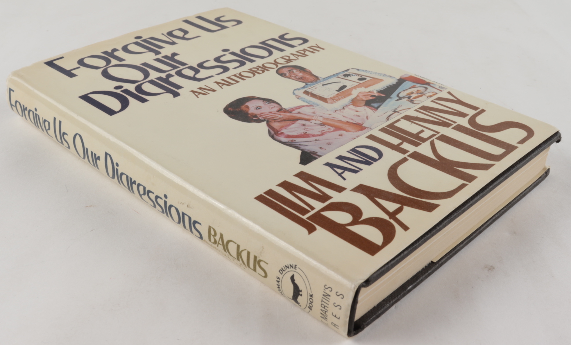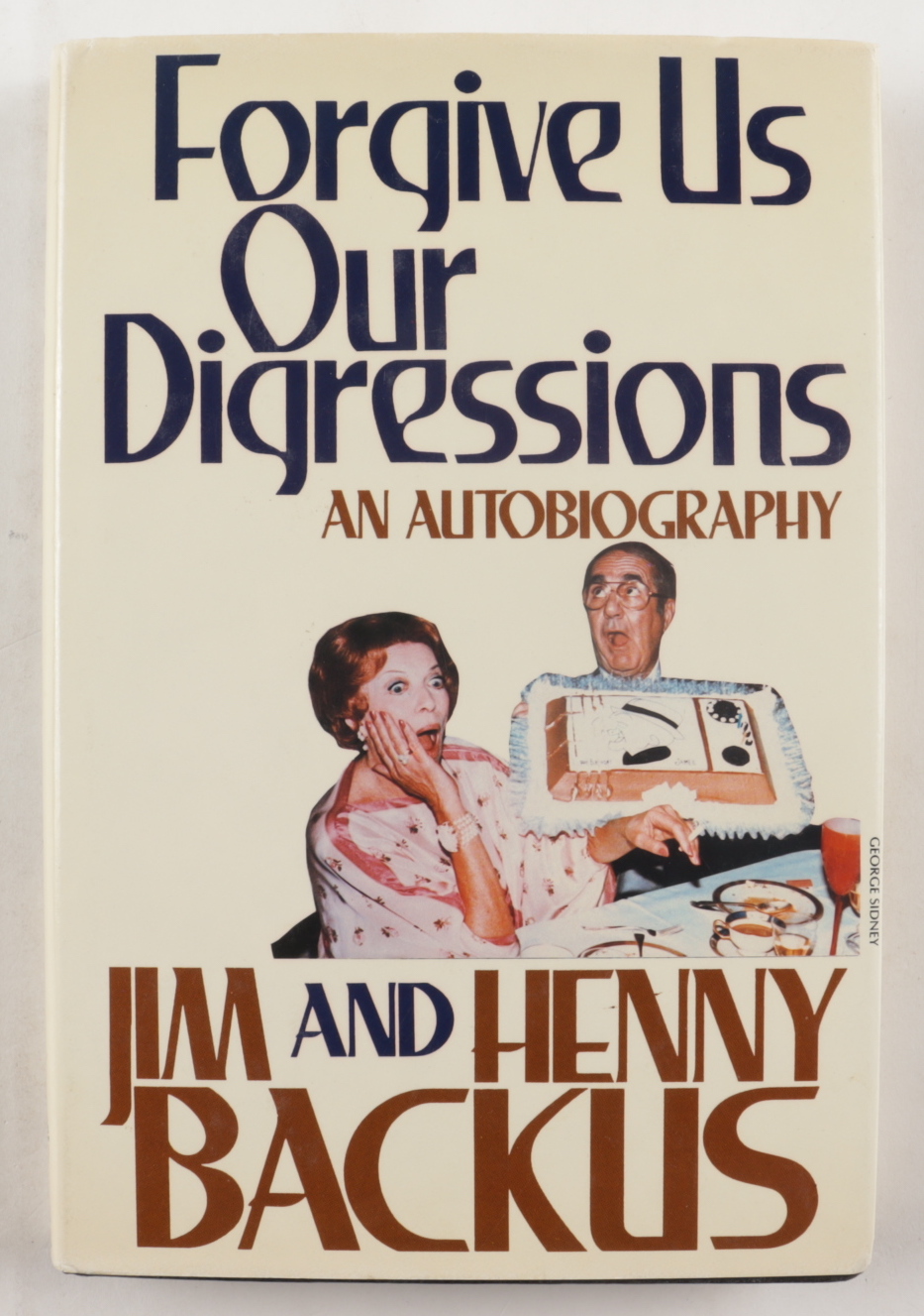"Forgive Us Our Digressions" hardcover Book. Hand-signed and inscribed on the title page by Jim Backus (D. 1989) and Henny Backus (D. 2004).
