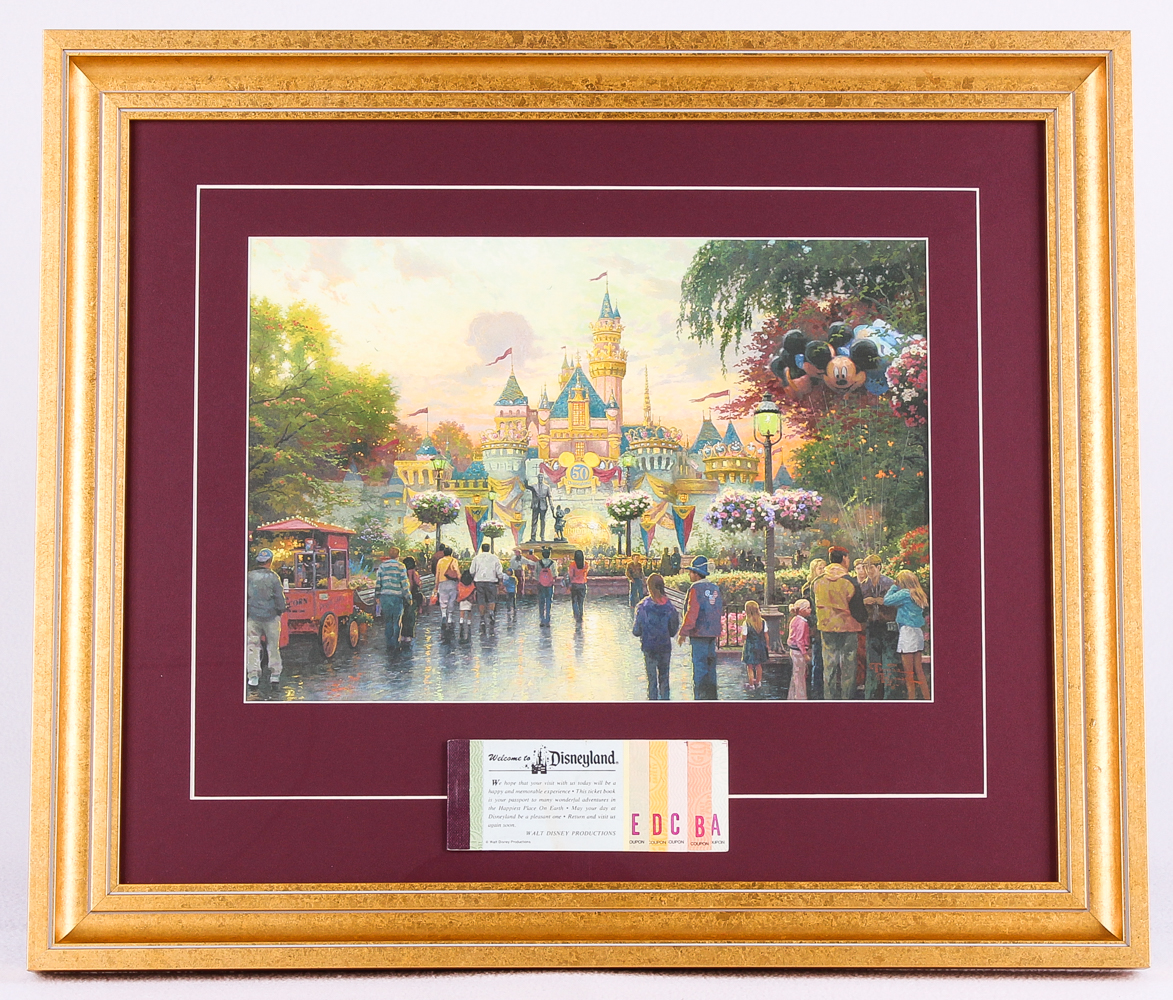 Thomas Kinkade 50th Anniversary "Disneyland" 18x21 Custom Framed Lithograph Display with Full Vintage Ticket Book