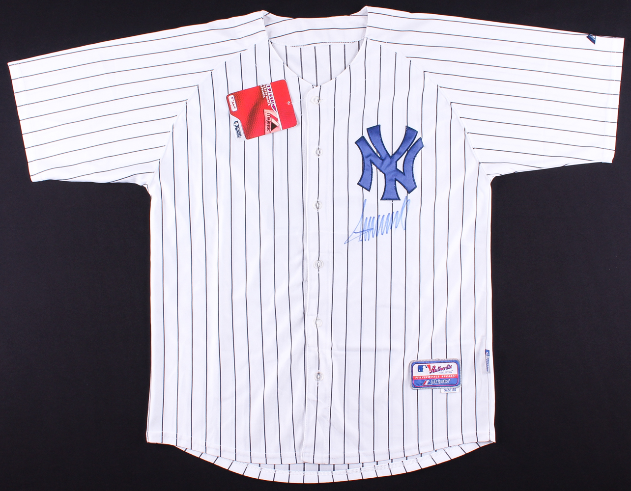 Majestic Cool Base on-field style jersey. Everything sewn on, size 50. Hand-signed in blue felt-tip pen by Donald Trump.