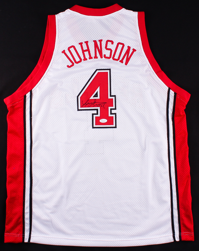 Custom on-court style jersey. Everything sewn on, size XL. Hand-signed in black felt-tip pen by Larry Johnson (Hornets, Knicks).