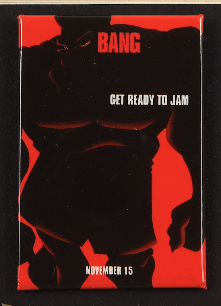 Custom frame measures approximately 15" x 24" in size and features a movie poster print and includes a set of (6) opening day promotional movie pins. Please note, the frame shows signs of wear. See photos for details.