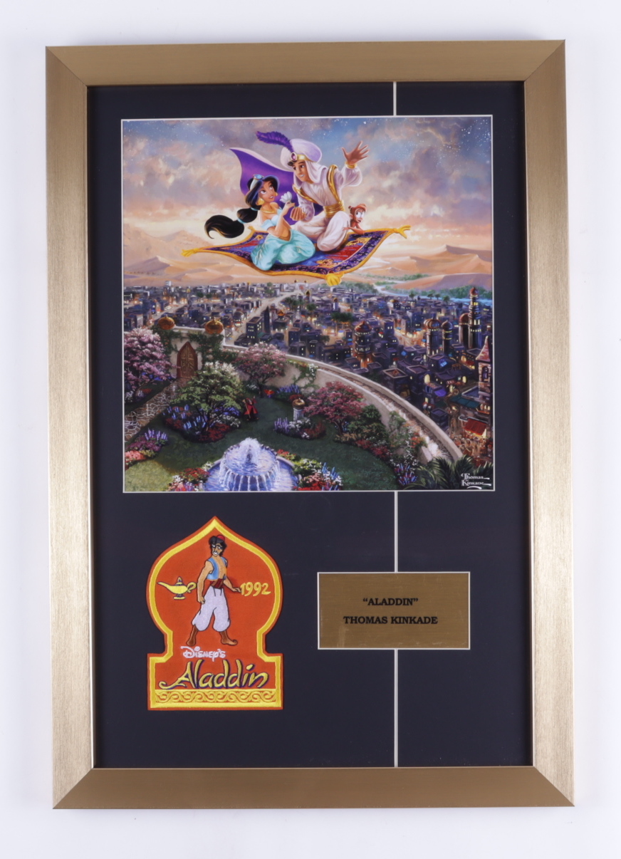 Custom frame measures approximately 15" x 22" in size and features a print from Thomas Kinkade (D. 2012). Includes a 1992 "Aladdin" Patch.