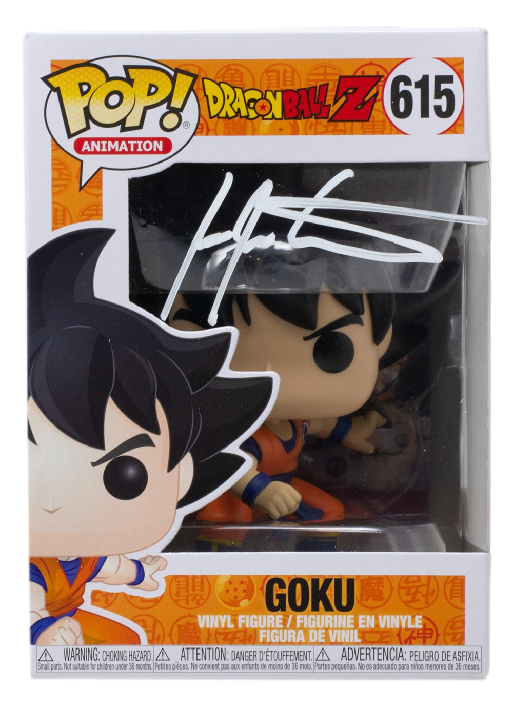 Funko Pop! vinyl figure measures approximately 4" tall and has been hand-signed by Ian James Corlett (Goku).