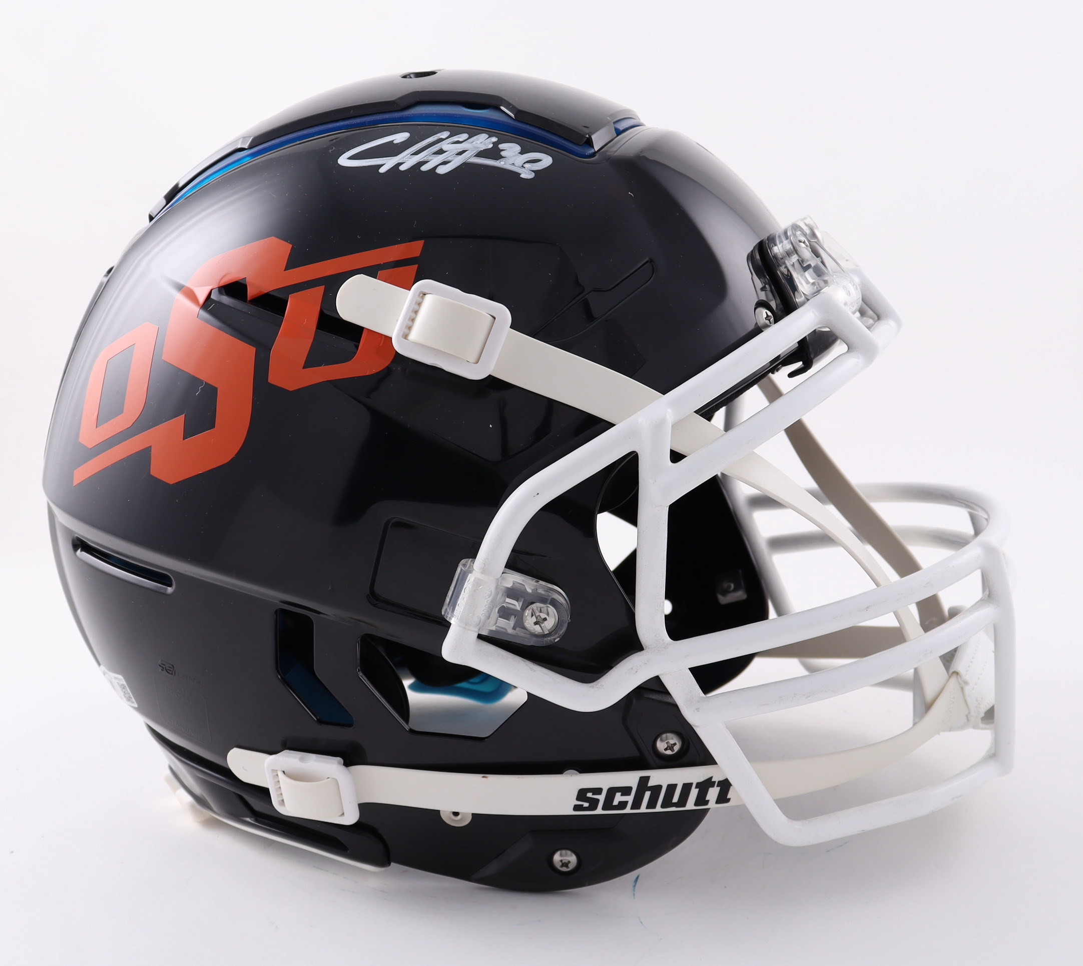 Schutt Oklahoma State Cowboys Full-Size Authentic On-Field F7 Helmet. Has been hand-signed by Chuba Hubbard.