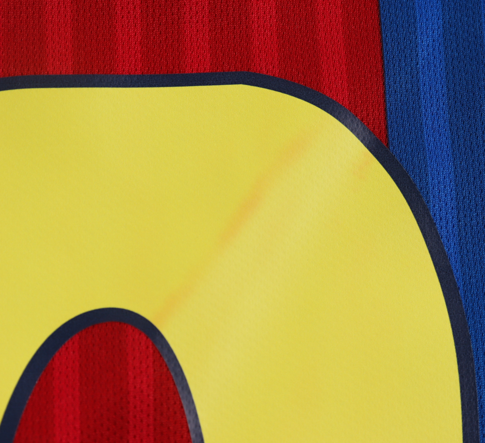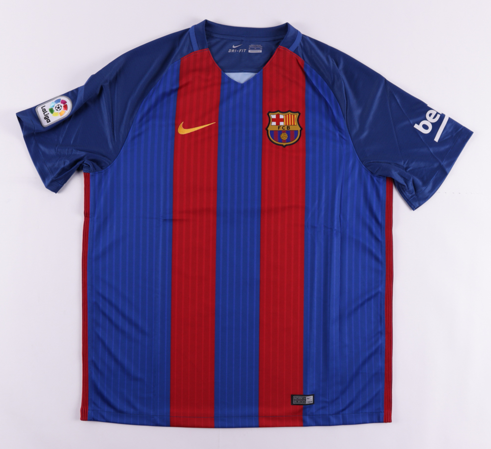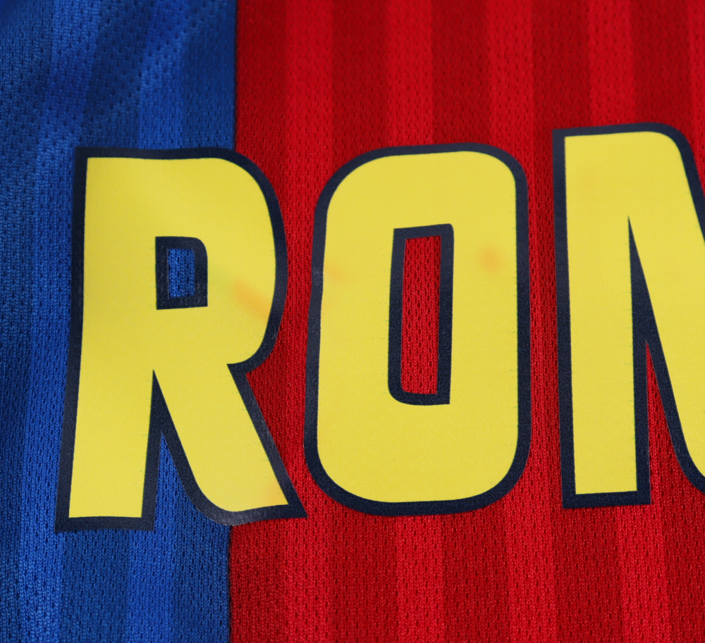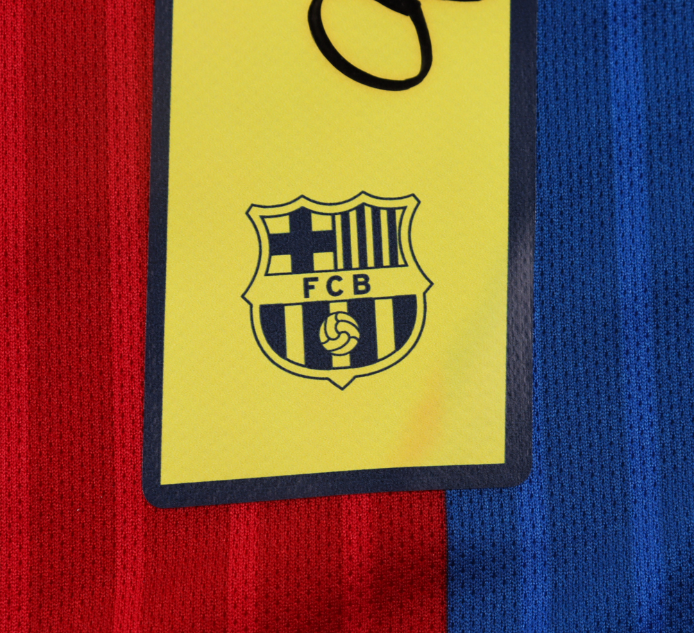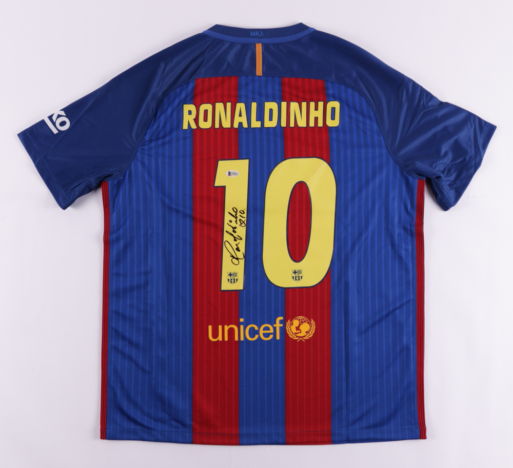 Nike on-field style jersey. Everything is printed on, size XL. Has been hand-signed and inscribed by Ronaldinho. Please note, there is staining on the reverse numbers and nameplate.