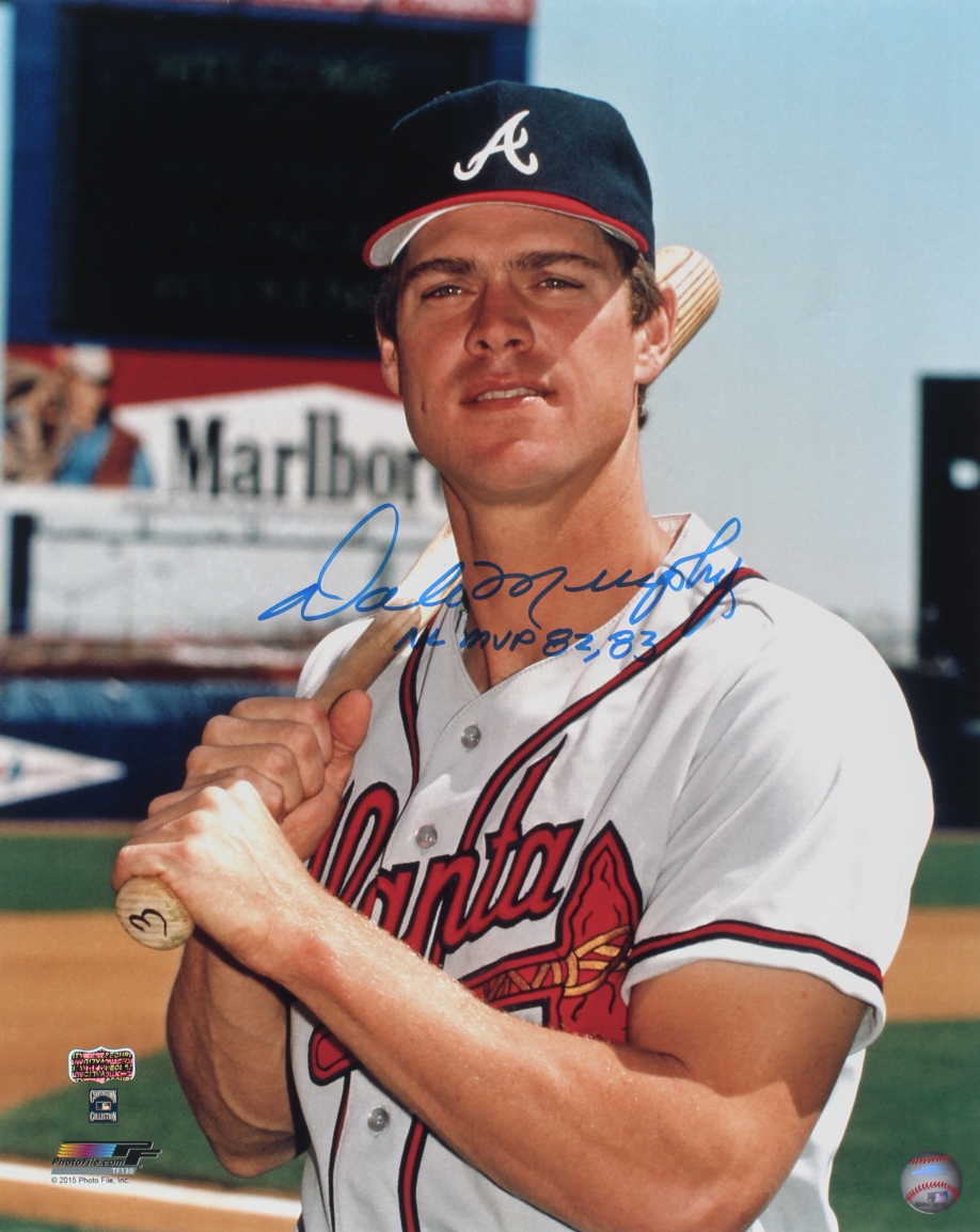 Photo measures 16" x 20" in size and has been hand-signed and inscribed by Dale Murphy (Atlanta Braves). Please note, there are some creases on the photo, as well as a small tear on the top left.