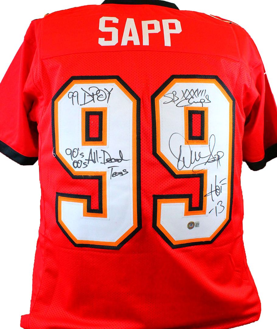 Warren Sapp Signed Jersey Inscribed "HOF 13", "SB XXXVII Champs", "99 DPOY", & "90's 00's All Decade Teams" (Beckett Hologram)