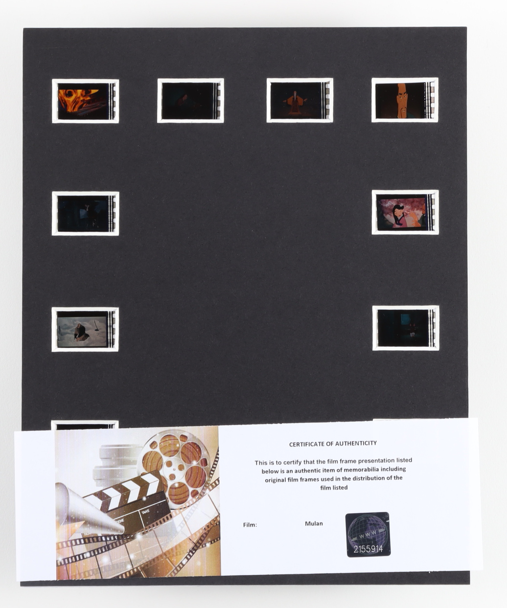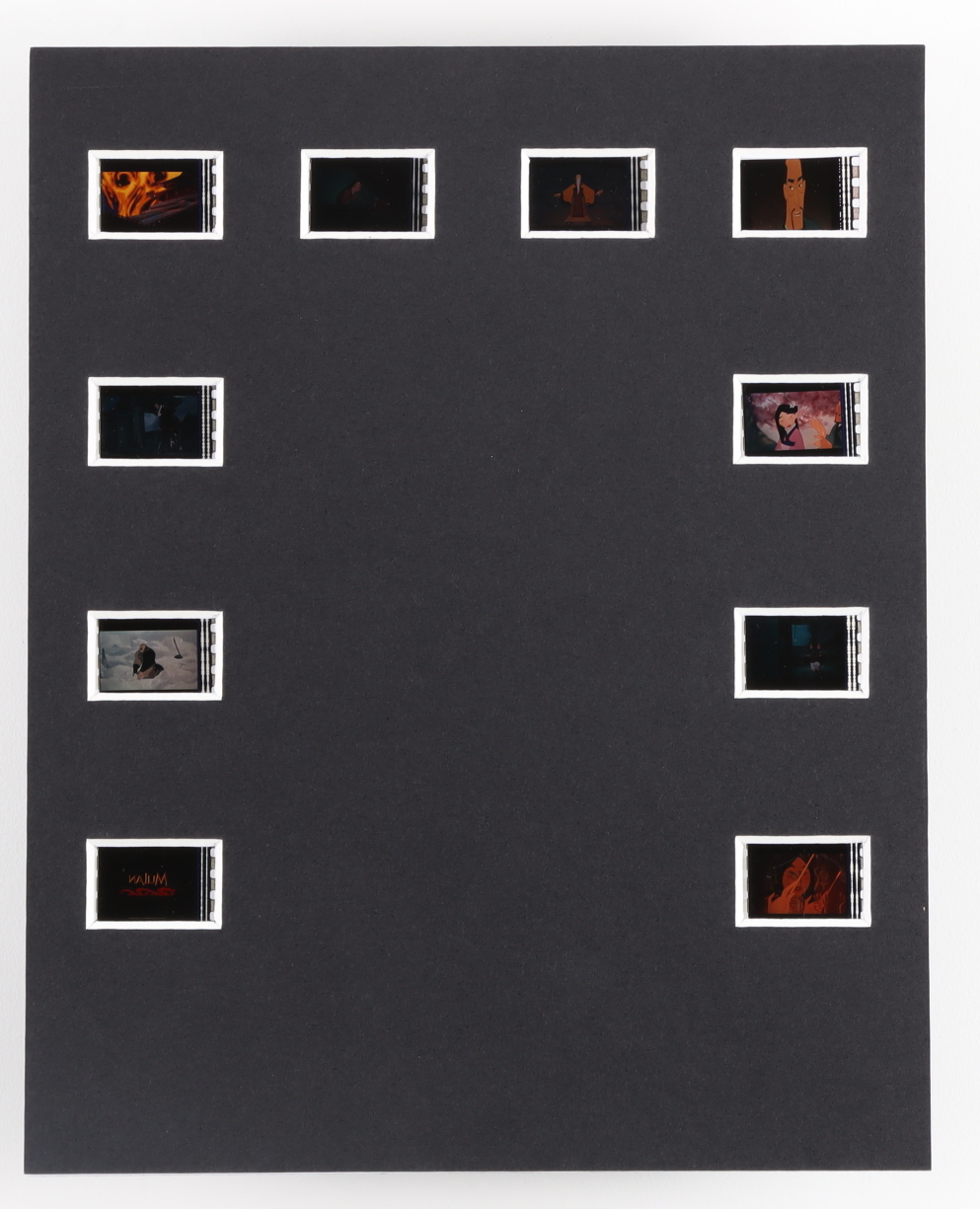 Unique, Original Movie Cell display on an 8” x 10” archival mat board with a photo of the featured film mounted alongside (10) individual, unique film cells from the movie/film. The back mat is cut identically to the front making each cell visible when held to a light. This is Limited Edition and comes with a COA detailing the origins of the piece and authenticity.