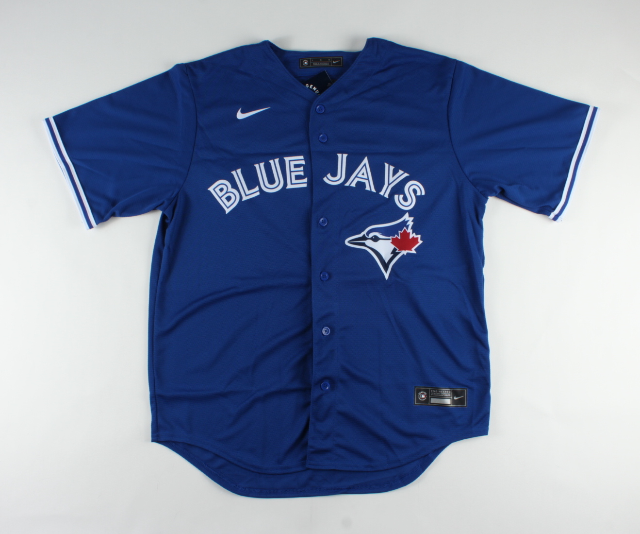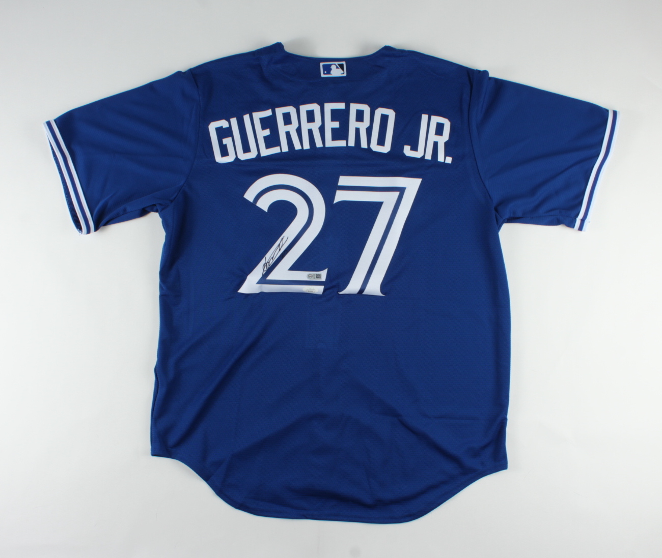 Nike on-field style jersey. Everything sewn on, size L. Has been hand-signed by Vladimir Guerrero Jr. (Toronto Blue Jays).