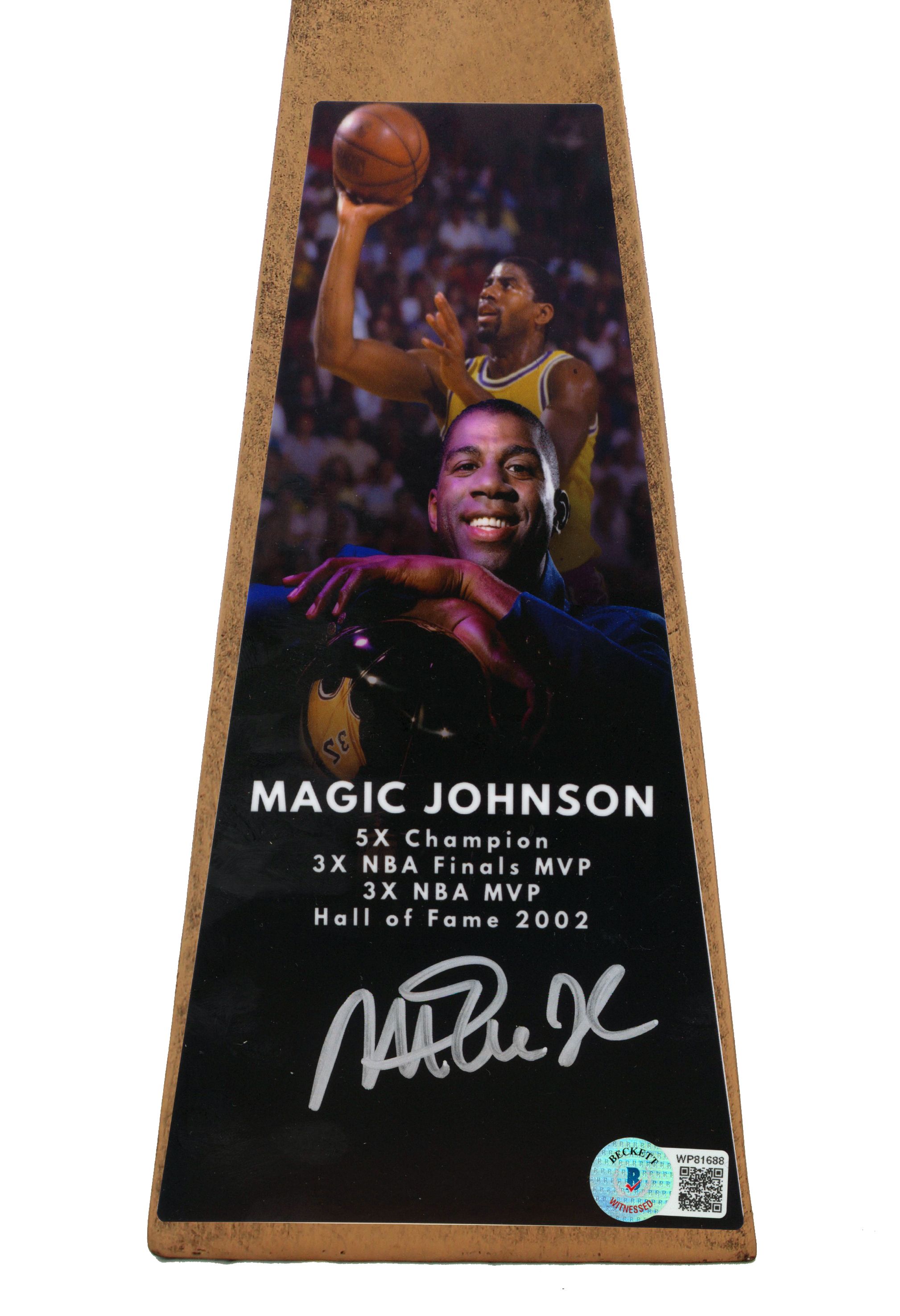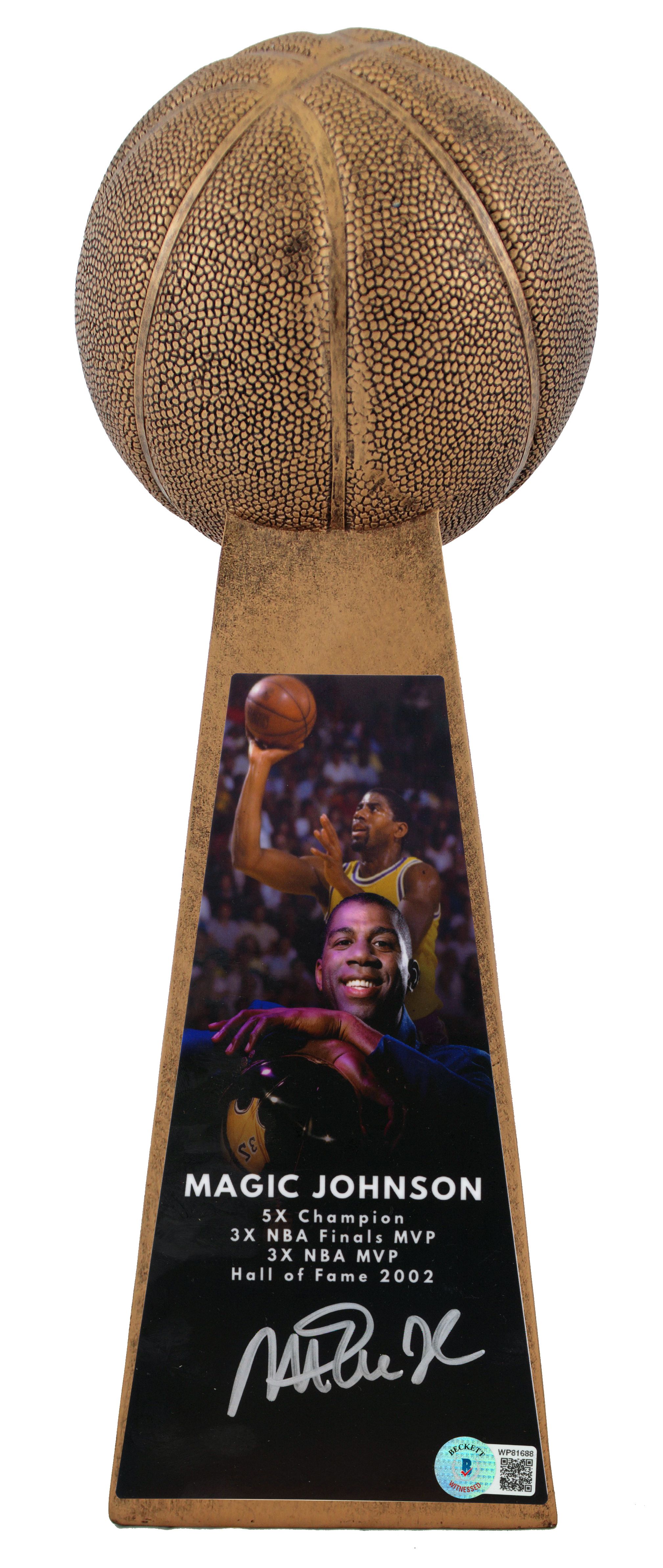 Replica championship basketball trophy measures approximately 14" in height and has been hand-signed by Magic Johnson (Los Angeles Lakers, HOF).