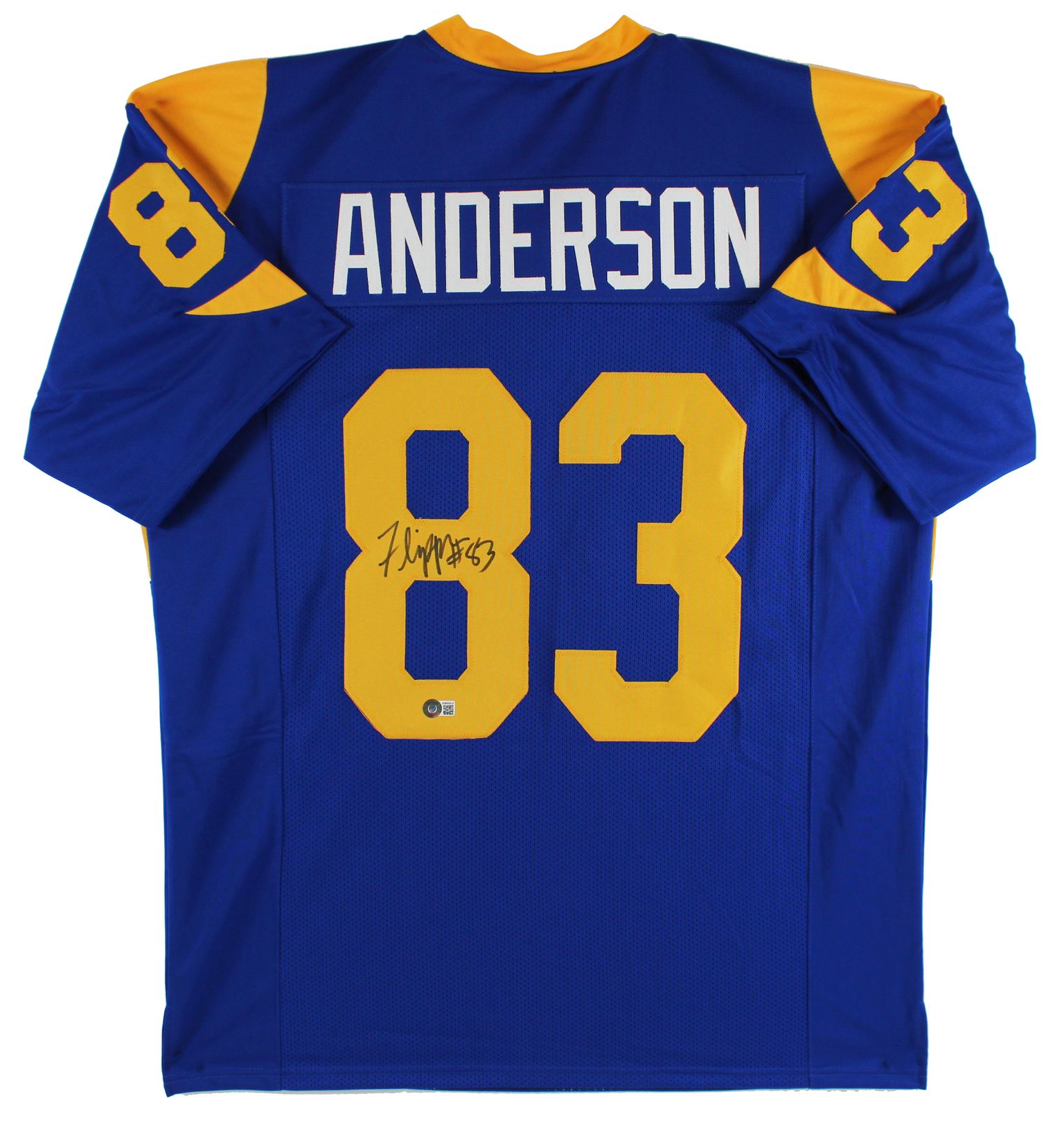 Custom on-field style jersey. Everything is sewn on, size XL. Hand-signed by Flipper Anderson.