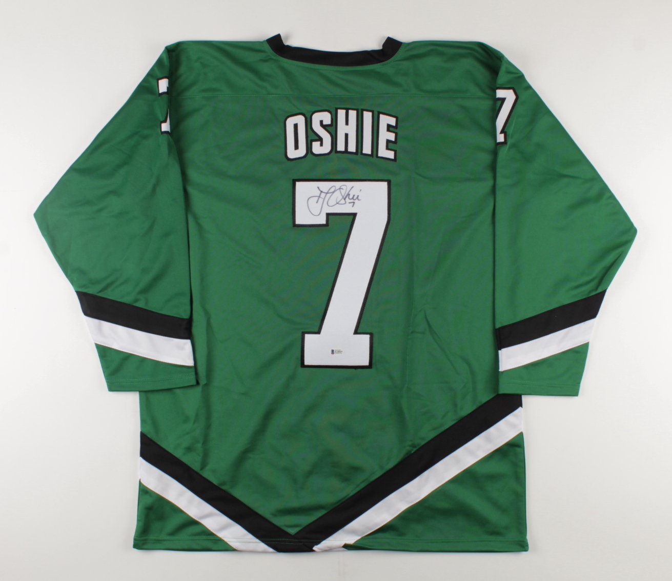 Custom on-ice style jersey. Everything is sewn on, size XL. Hand-signed by T. J. Oshie.