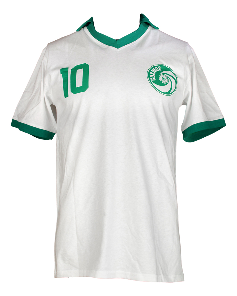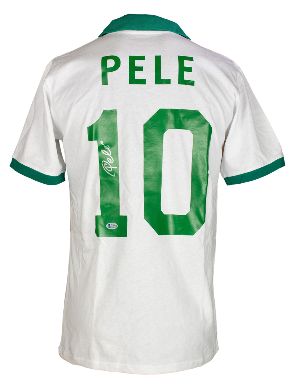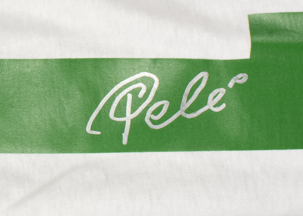Custom on-field style jersey. Everything is printed on, size XL. Hand-signed by Pele (HOF).