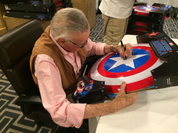 Custom framed display features a shield which has been hand-signed in black felt-tip pen by Stan Lee.