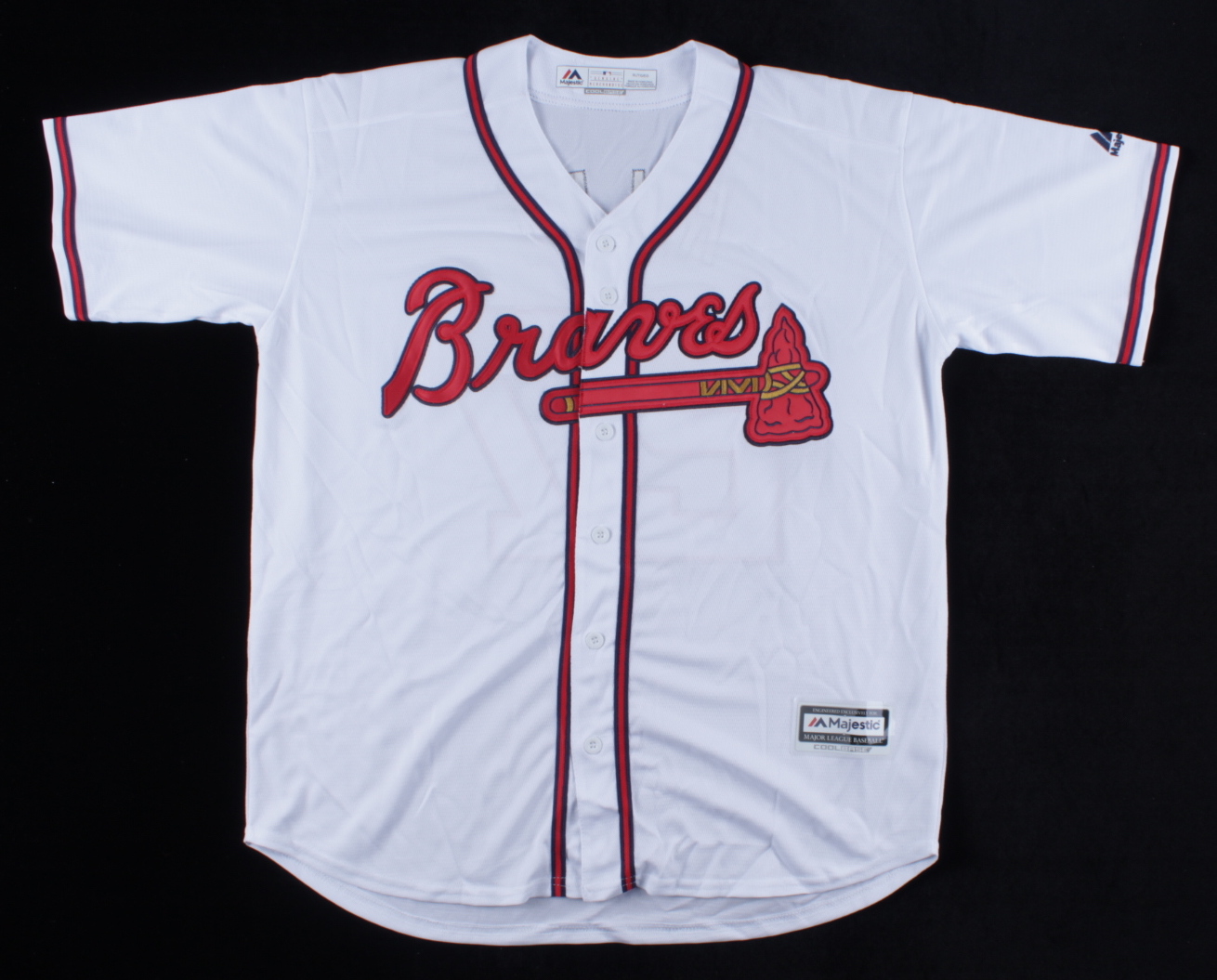 Majestic on-field style jersey. Everything sewn on, size XL. Hand-signed and inscribed by Austin Riley (Atlanta Braves).