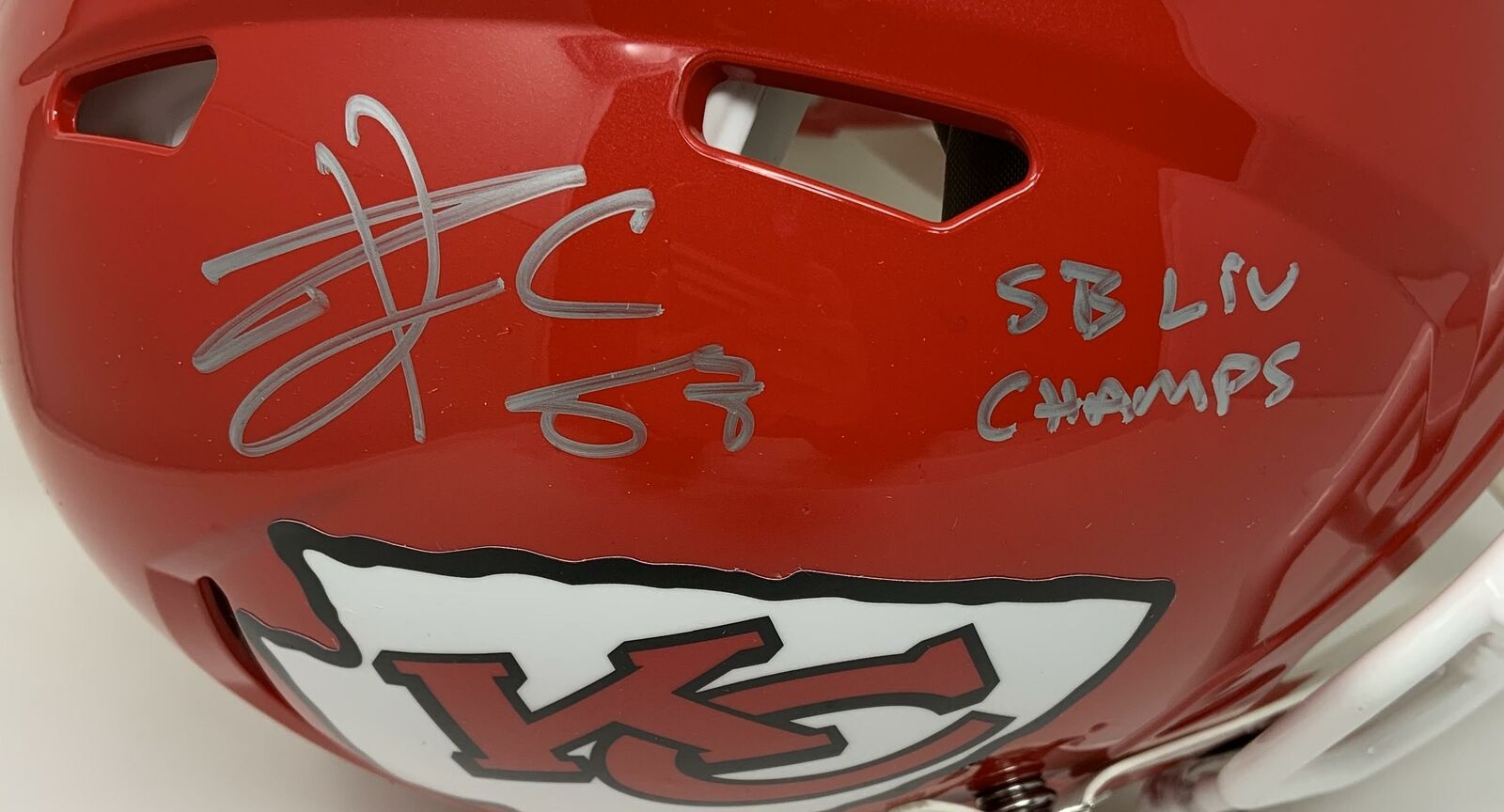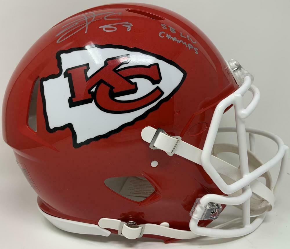 This authentic speed helmet has been personally hand-signed by Travis Kelce with the inscription "SB LIV CHAMPS." It is officially licensed by the National Football League and comes with an individually numbered, tamper-evident hologram from Fanatics Authentic. To ensure authenticity, the hologram can be reviewed online. This process helps to ensure that the product purchased is authentic and eliminates any possibility of duplication or fraud.