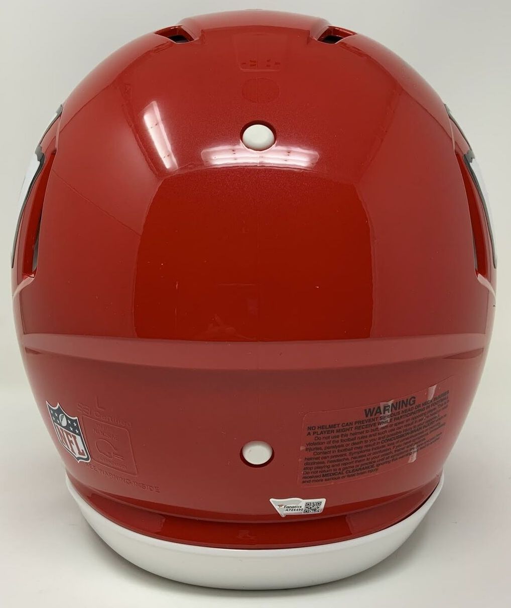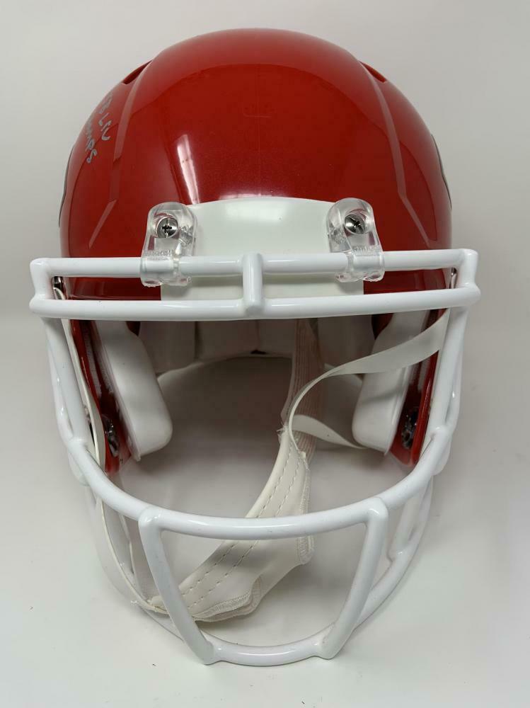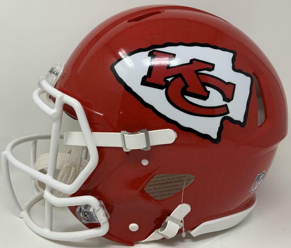 Riddell Kansas City Chiefs full-size authentic on-field speed helmet. Hand-signed and inscribed by Travis Kelce.