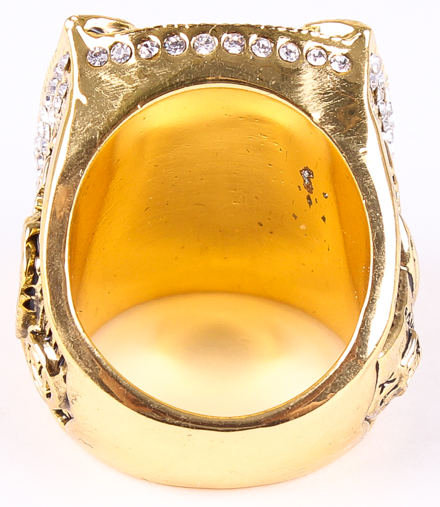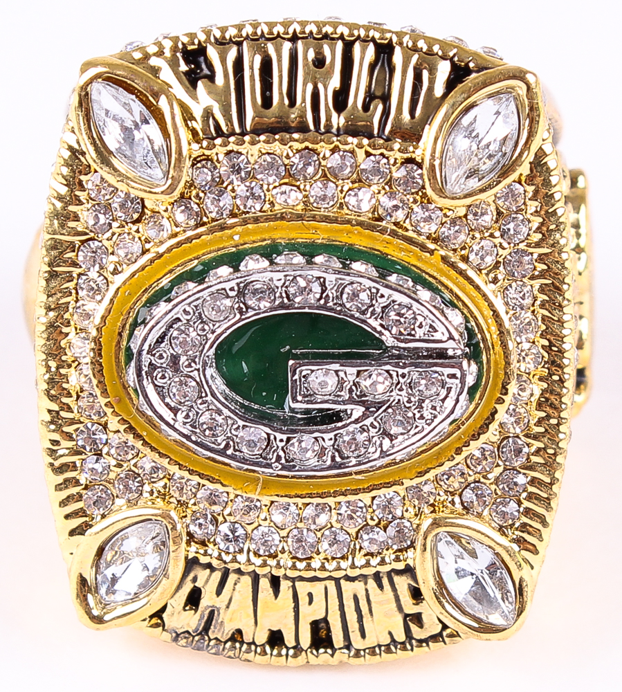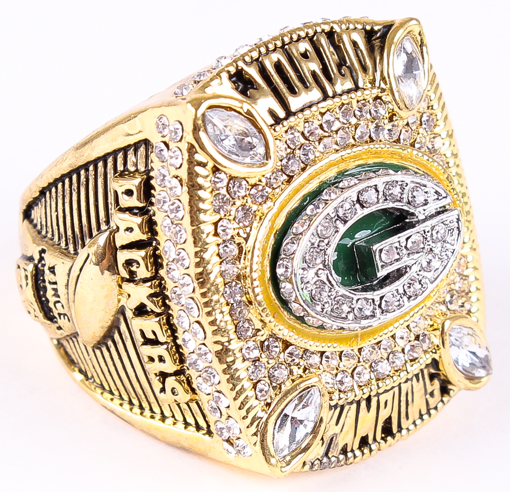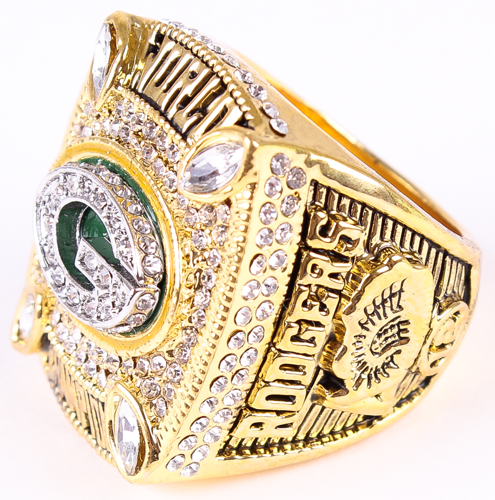 Aaron Rodgers Packers High Quality Replica 2010 Super Bowl XLV Championship Ring. The ring has been hand crafted by professional jewelers. Made of metal alloy and clad with gold. Size 11.5.