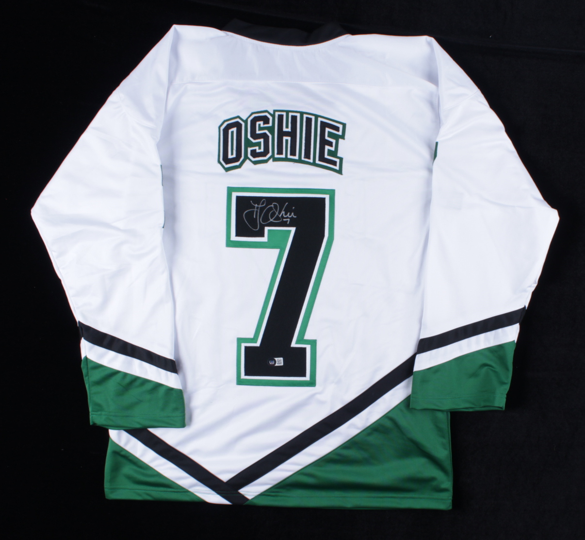 Custom on-ice style jersey. Everything is sewn on, size XL. Hand-signed by T. J. Oshie.