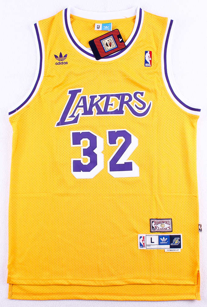 Adidas Hardwood Classics on-court style jersey. Everything sewn on, size L (Length +2). Hand-signed in silver paint pen by Magic Johnson (Lakers HOF).