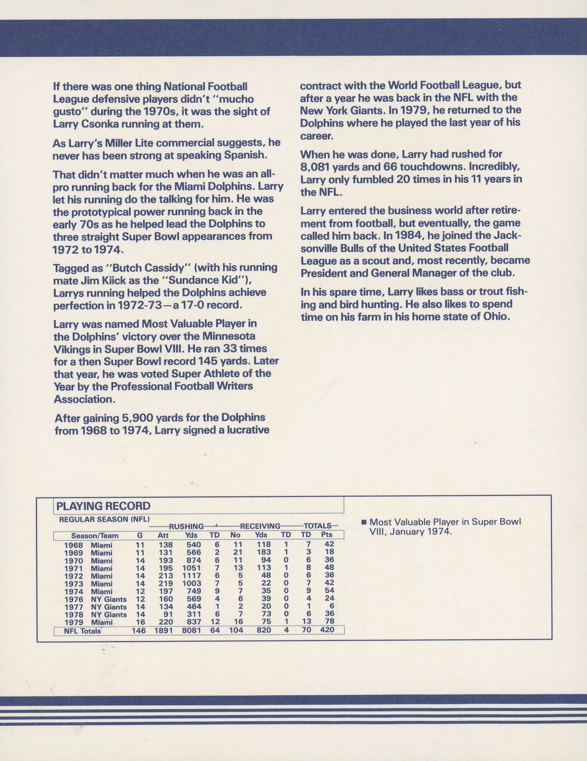 Photo measures 6" x 8" in size and has been hand-signed by Larry Csonka (Miami Dolphins, HOF). Please note, the autograph has been personalized "To Tom."