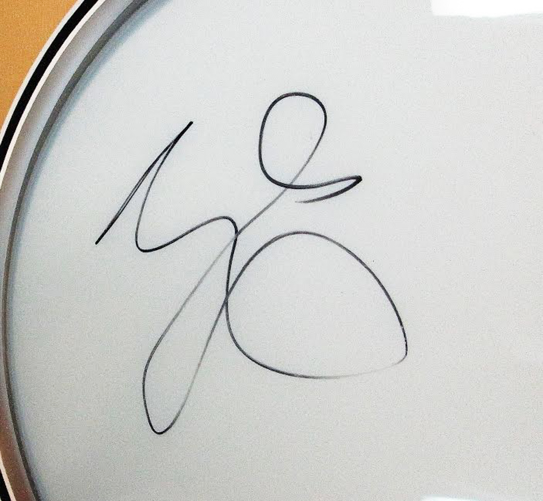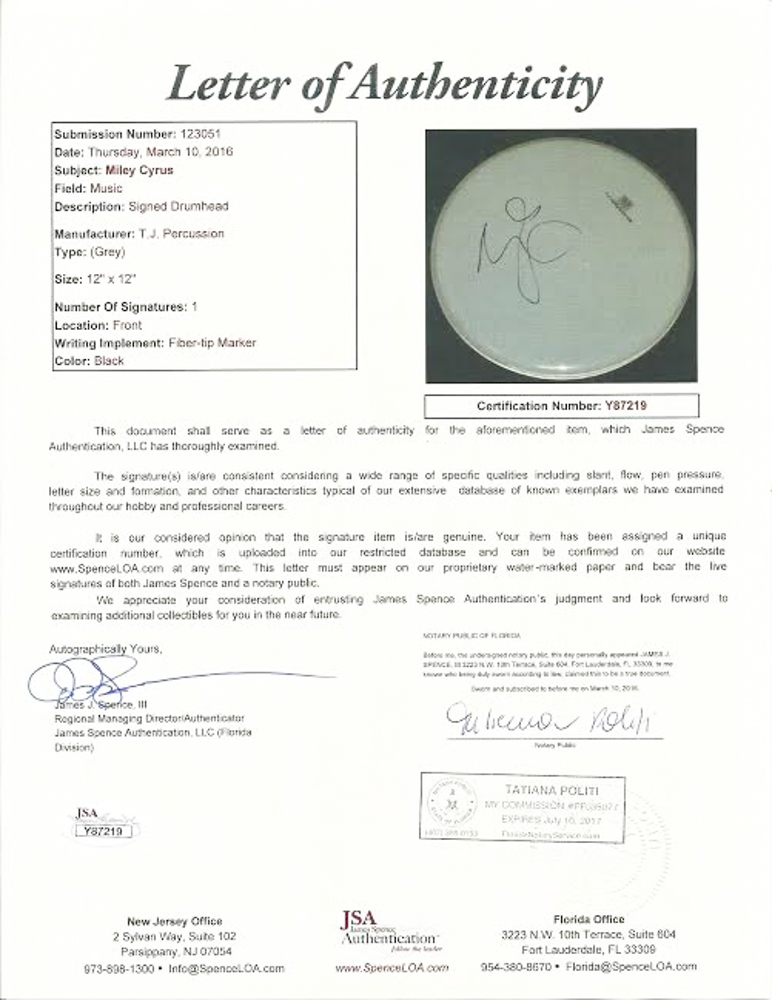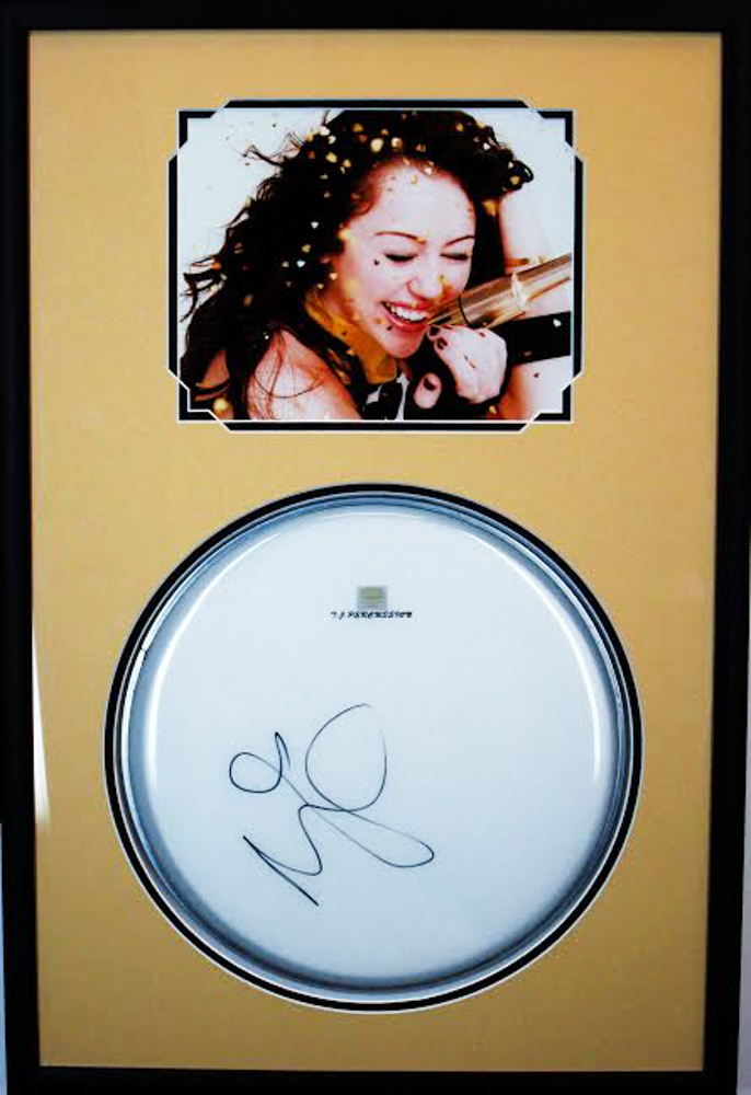 Display measures approximately 18" x 27" in size and features a drumhead measuring 12" in diameter that has been hand-signed in black felt-tip pen by Miley Cyrus. Professionally framed with acid-free mats and premium clear glass.