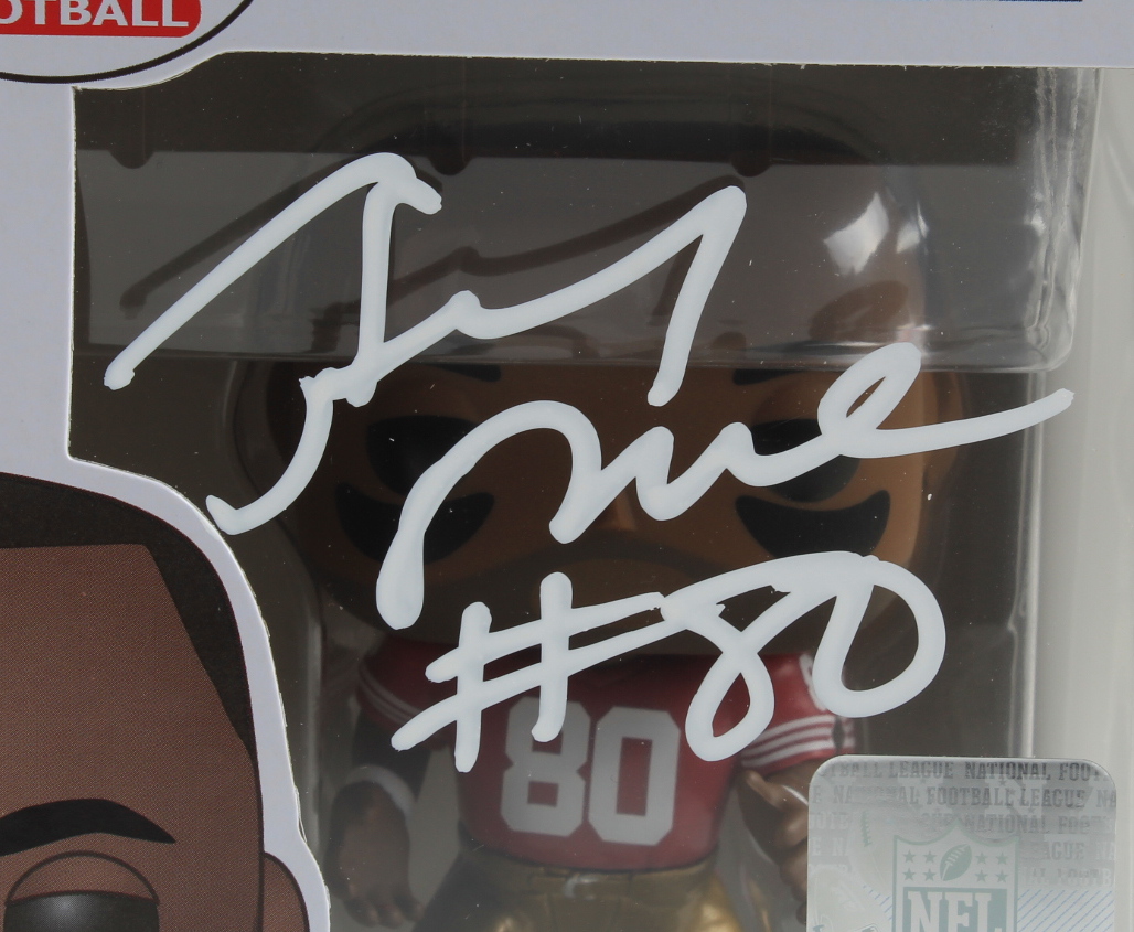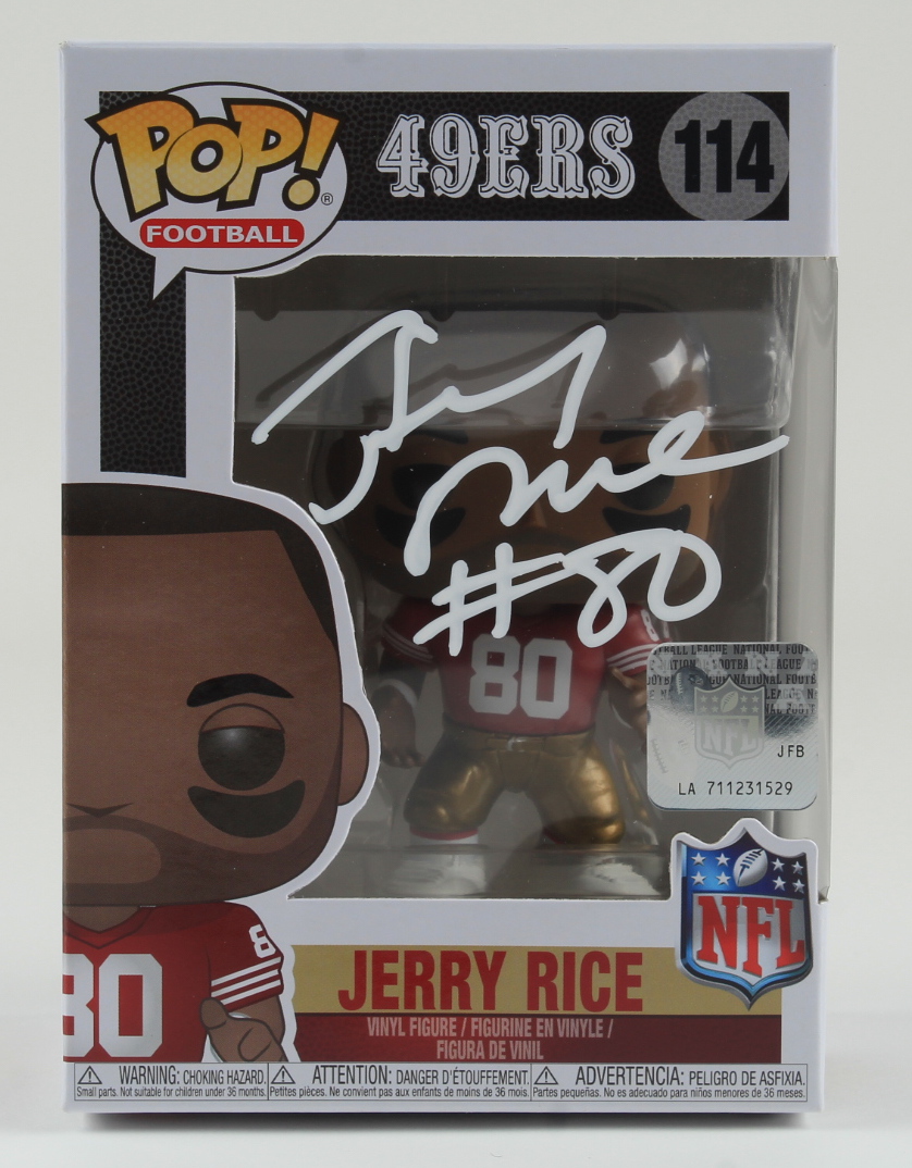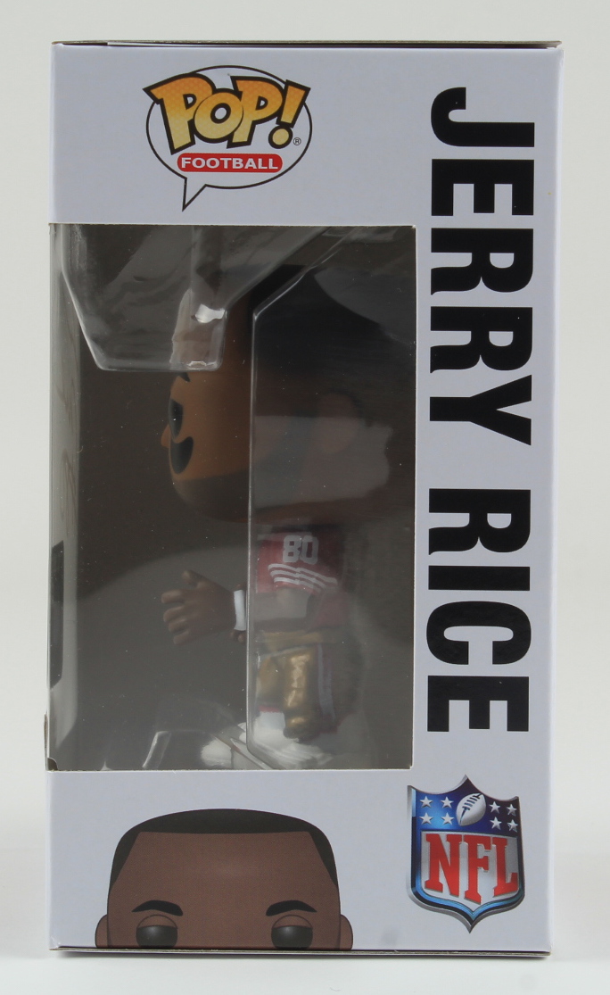 Funko Pop! vinyl figure measures approximately 4" in height and has been hand-signed on the packaging by Jerry Rice (San Francisco 49ers, HOF).