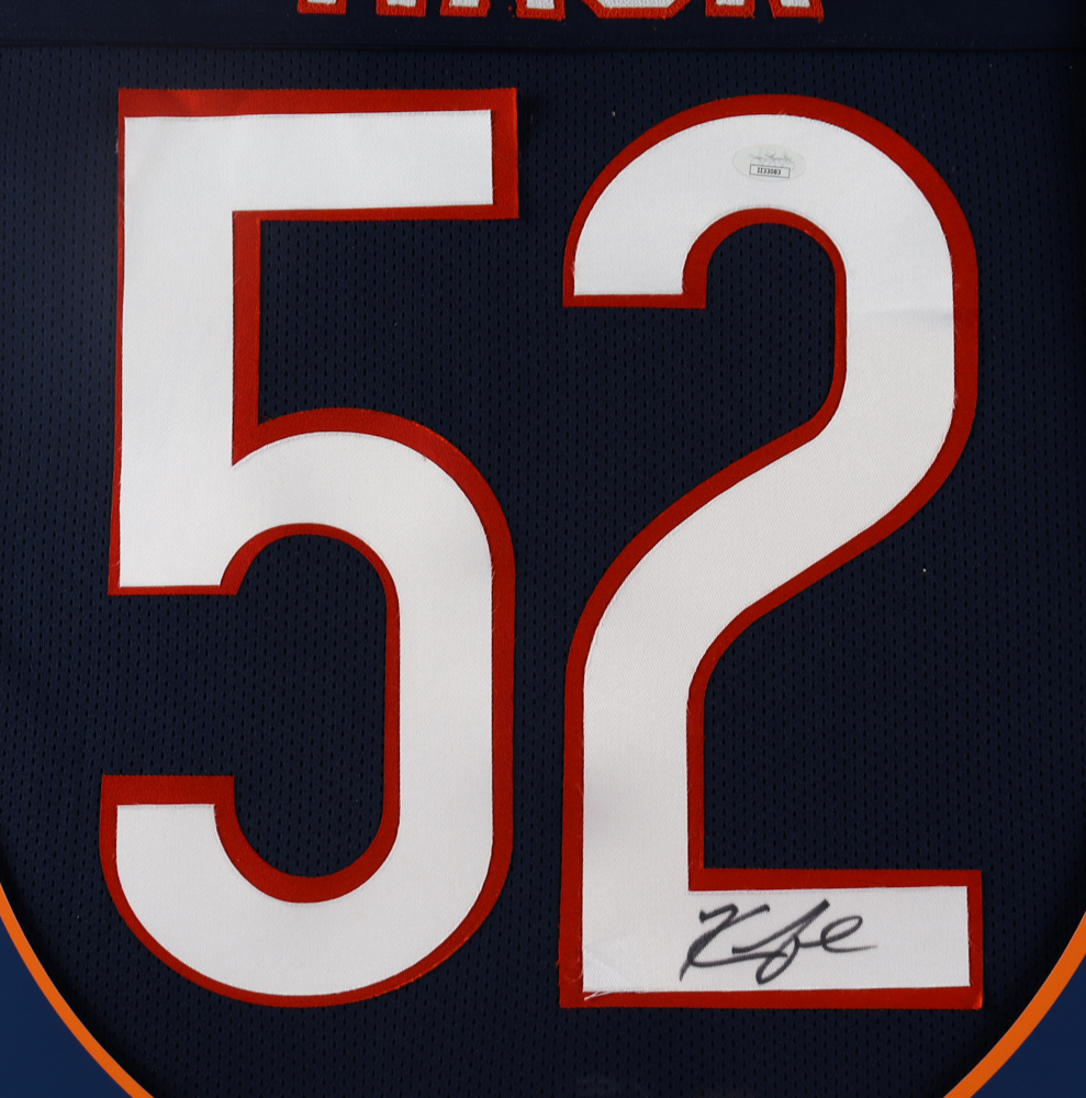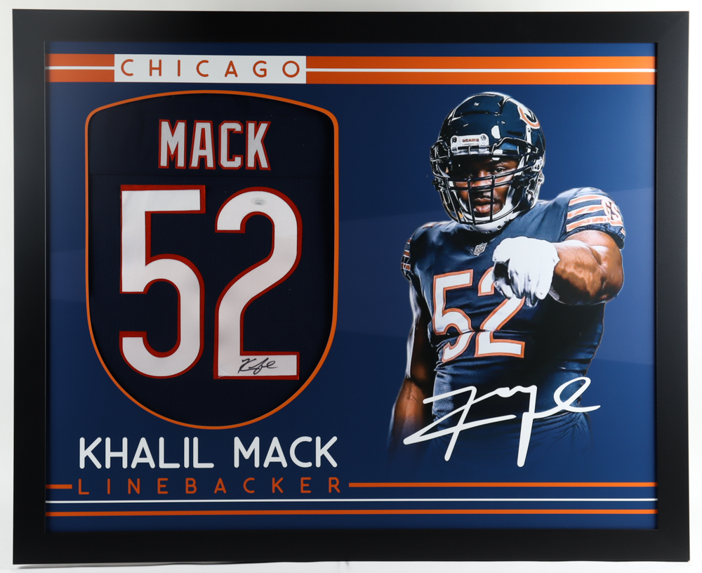 Custom frame measures 35" x 43" in size and features a jersey that has been hand-signed by Khalil Mack. Please note, due to the large size of these frames, some player images may be pixelated. Please see the close-up photo in the listing for item condition.
