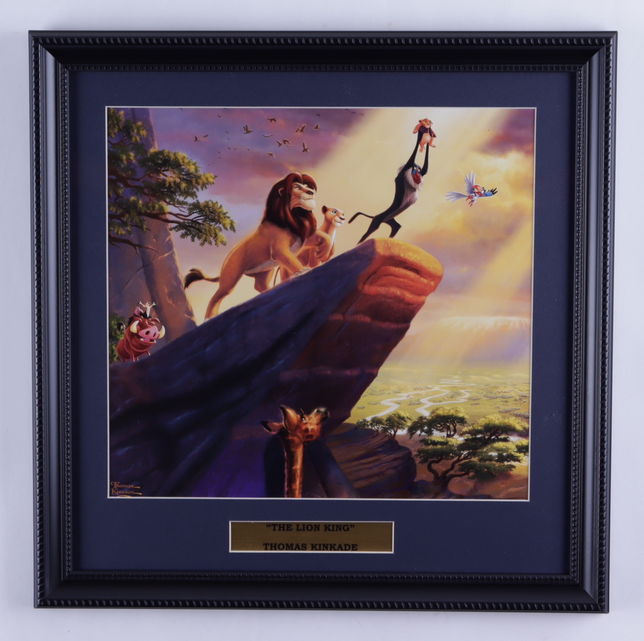 Custom framed display measures approximately 16" x 16" in size and features a print of "The Lion King" by Thomas Kinkade (D. 2012).