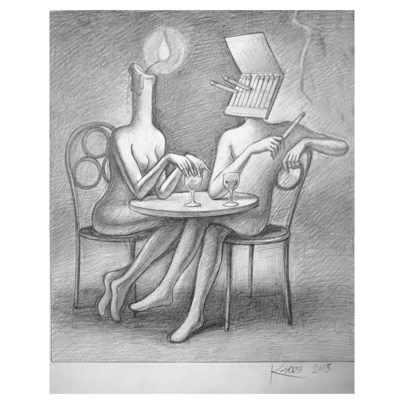 "The Perfect Match" is an original artwork, pencil on paper, by Mark Kostabi. The piece is hand signed and comes with a certificate of authenticity. Measures approximately 14" x 11".