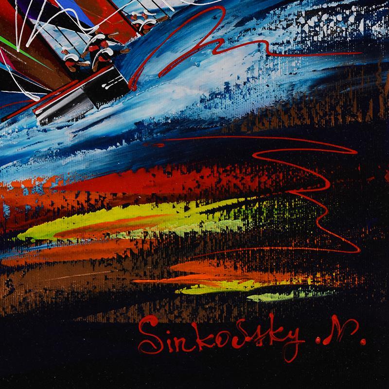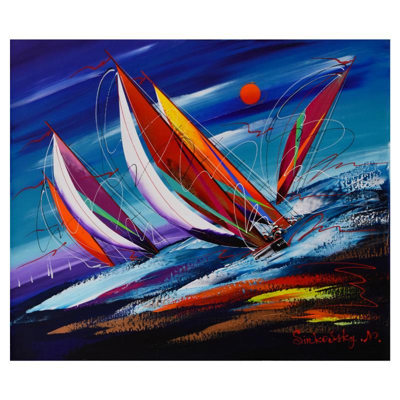 Born in 1959, in Kazakhstan, Natalia Sinkovsky finished her Master’s in Architecture in her homeland, where she also took drawing and painting courses. Sinkovsky immigrated to Israel with her family in 1995 and initially worked as an interior designer and architect, before expanding into painting professionally in 2002. Primarily painting in acrylic, Sinkovsky initiates her artistic process with an idea, rather than a predefined sketch, and applies layers of paint in thick application using a palette knife, before adding small graphic elements. She appreciates all art styles and movements, but is primarily inspired by abstract art and modern design, due in part to her background in architecture. Her sailboats series are influenced by her appreciation for the Expressionist, Baroque, and Cubist movements. In her artwork, Sinkovsky employs bright, cheerful colors to complement her optimistic outlook on life.